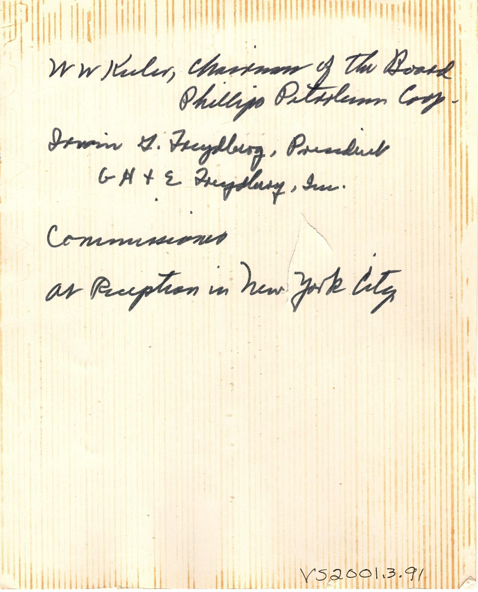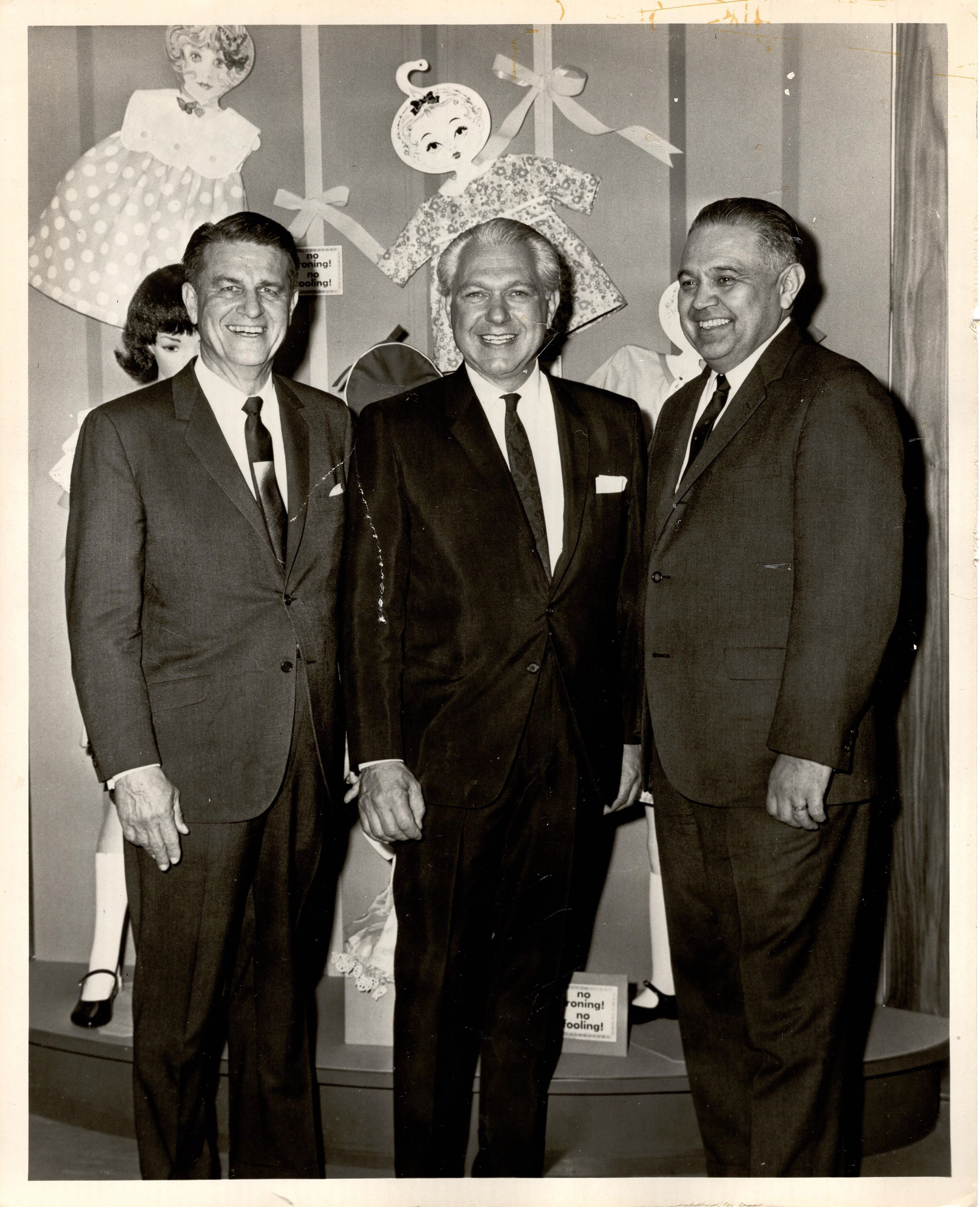Black and white photograph of Robert Bennett standing shoulder to shoulder with two other men, all wearing suits. There are cut out doll decorations behind them and a female mannequin. Written in black ink on the back "W W Keeler, Chairman of the Board, Phillip Peter- Corp. Irwin G. Freydberg, President, GH& E Freydberg, Inc. Commissioner at Reception in New York City."Photograph Details