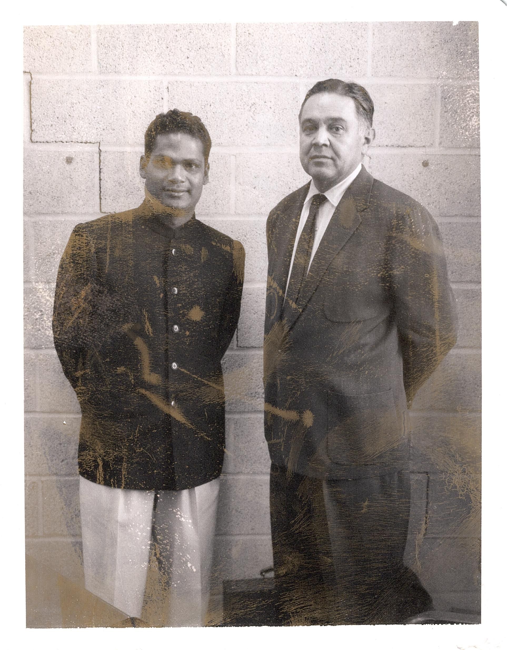 Black and white photograph of Robert Bennett with a young man in possibly a military uniform. They are standing in front of a cinder block wall.Collection