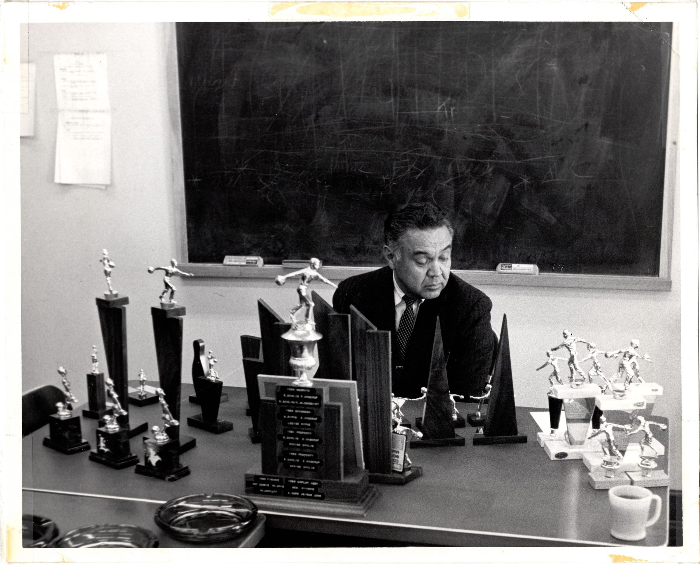 Black and white photograph of Robert Bennett sitting at a desk with a large chalkboard behind him. On the desk are numerous trophies, they appear to be sports trophies, possibly bowling trophies or perhaps discus. Bennett has been acknowledged as a founder of the American Indian Athletic Hall of Fame on Haskell Institute's campus.Photograph Details