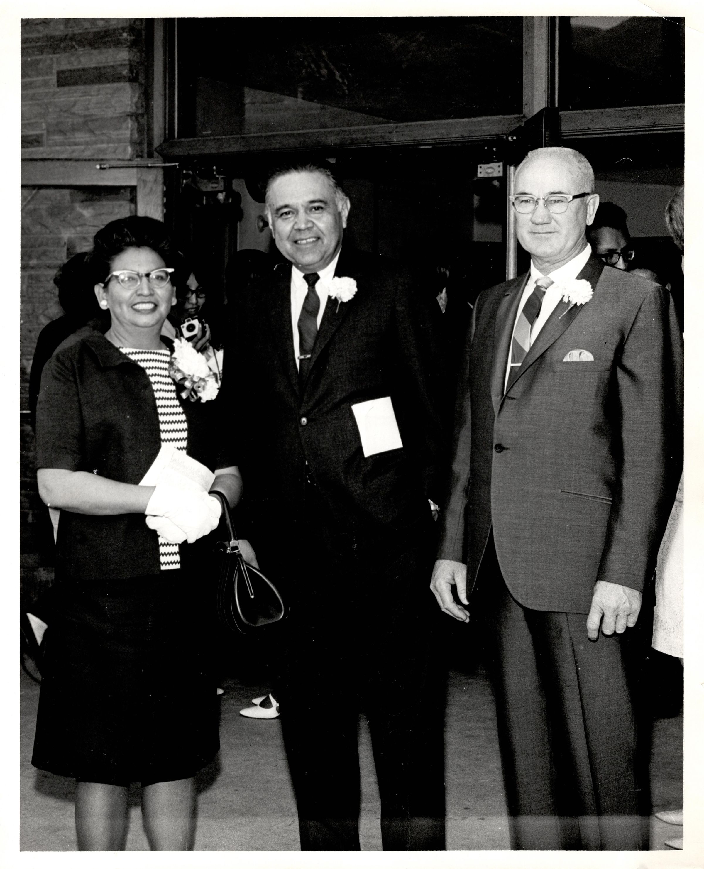 Black and white photograph of Robert Bennett standing between a man and a woman in front of open double doors. Written in ink on the back "Intermountain School, 5-14-67."Photograph Details