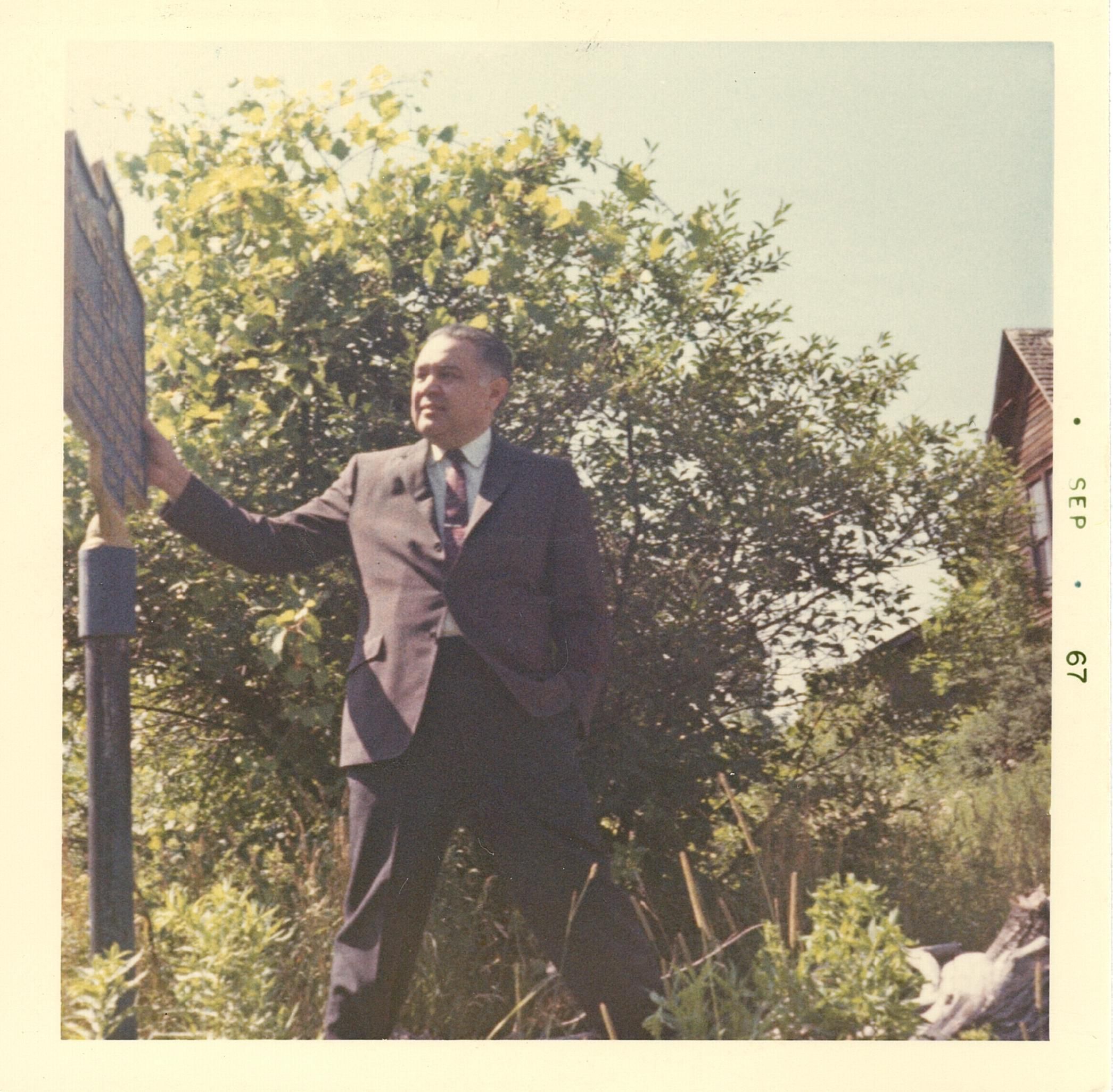 Colored photo of Robert Bennett standing outside next to a historical marker. He is reaching out his right hand to the marker. There is a two story house with wood siding in the background.Photograph Details