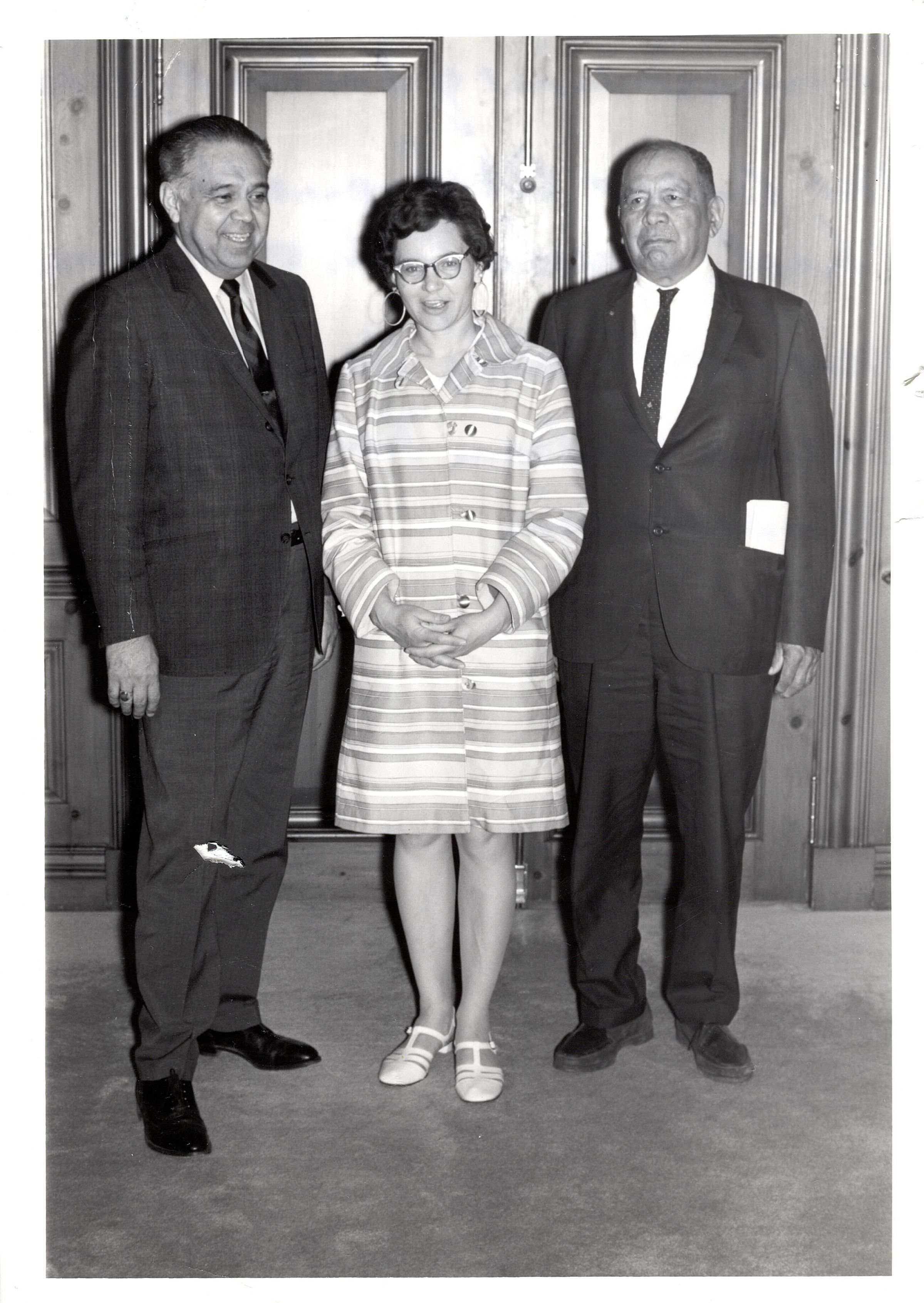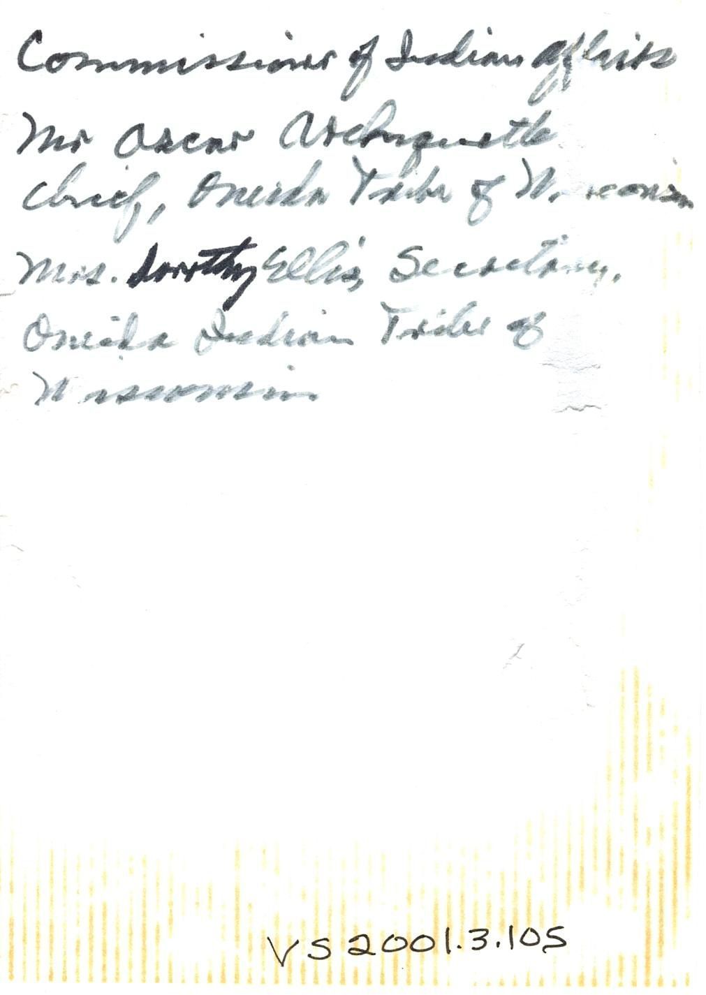 Black and white photograph of Robert Bennett standing next to Dorothy Ellis and Oscar Archiquette in front of large wood double doors. The woman is wearing a striped button up jack. Both men are wearing suits and ties. Archiquette has paper rolled up and sticking out of his front pocket. Written in black ink on the back "Commissioner of Indian Affairs, Mr. Oscar Archiquette, chief, Oneida Tribe of Wisconsin, Mrs. Dorothy Ellis, Secretary, Oneida Indian Tribe of Wisconsin".Photograph Details