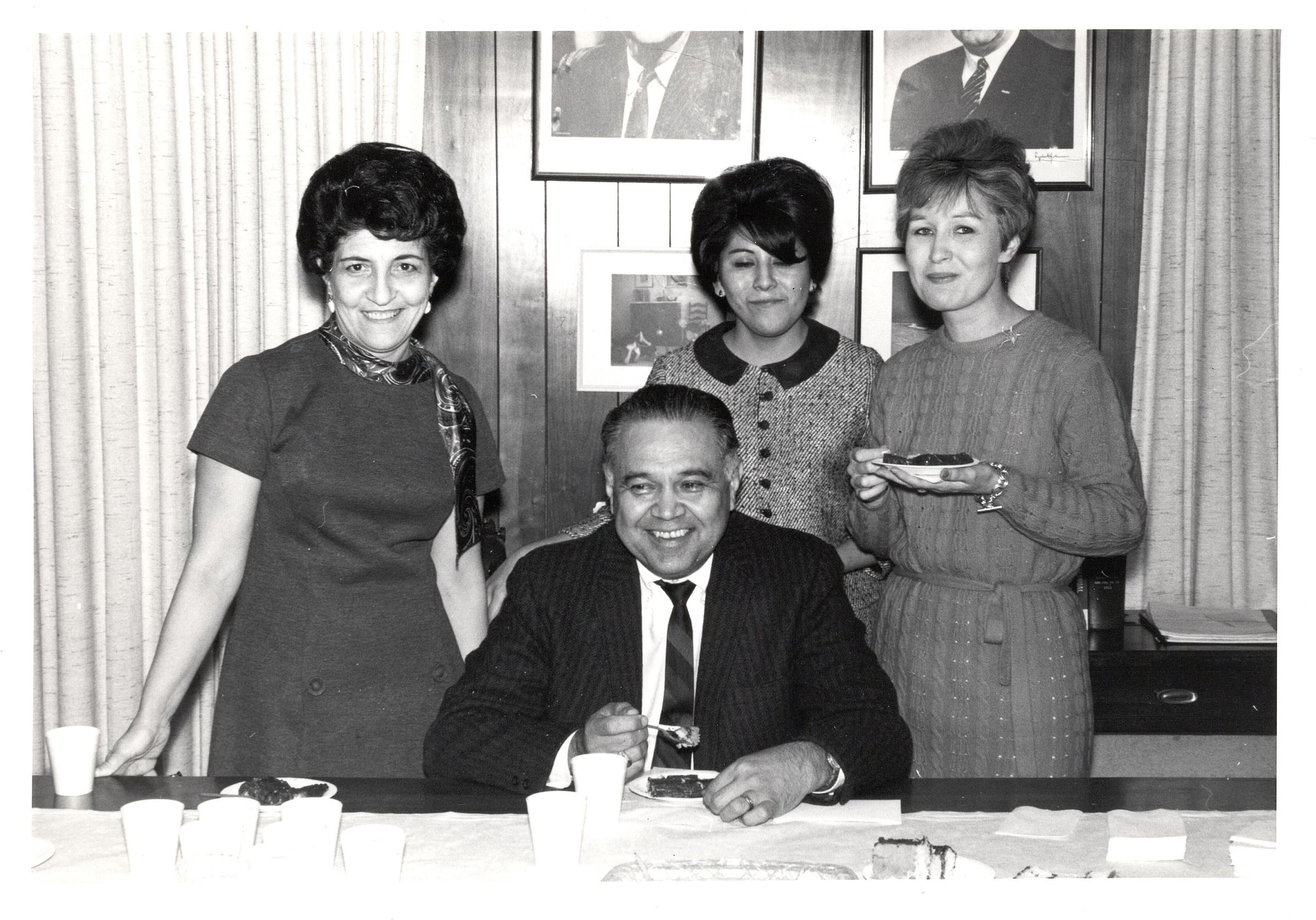 Black and white photograph of Robert Bennett sitting at a table with three women standing behind him. Bennett has a fork full of food from a small plate in front of him. The woman on the right is holding a plate of food in her left hand. The woman in the middle has her eyes closed. The woman on the left is wearing a scarf around her neck.Collection