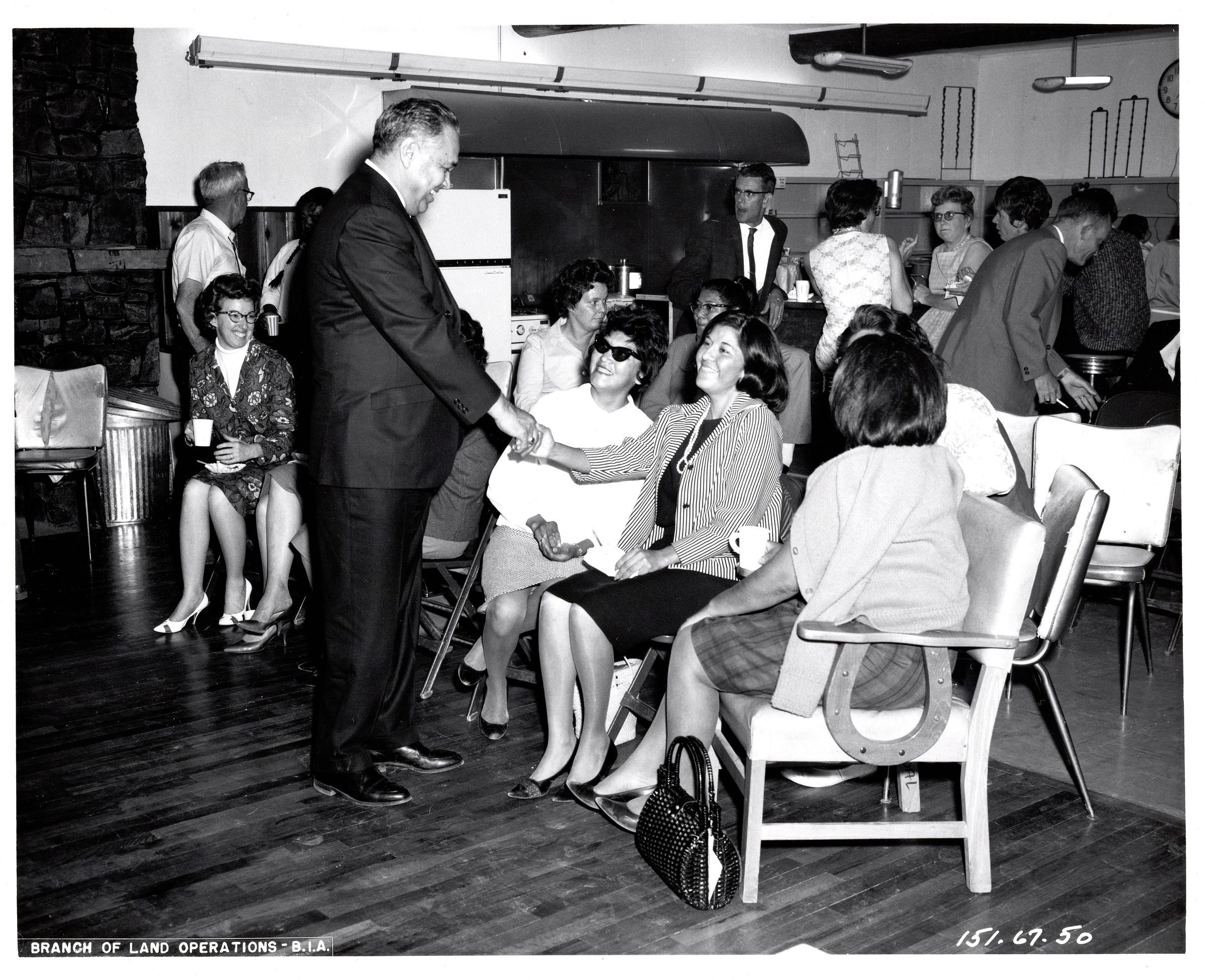 Black and white photograph of Robert Bennett shaking hands with a woman as she sits next to two to three other woman. There are numerous other men and women behind them. Typed in the bottom left corner of the photo "Branch of Land Operations-B.I.A." and written in white ink on photo in opposite corner on the front "151.67.50"Collection
