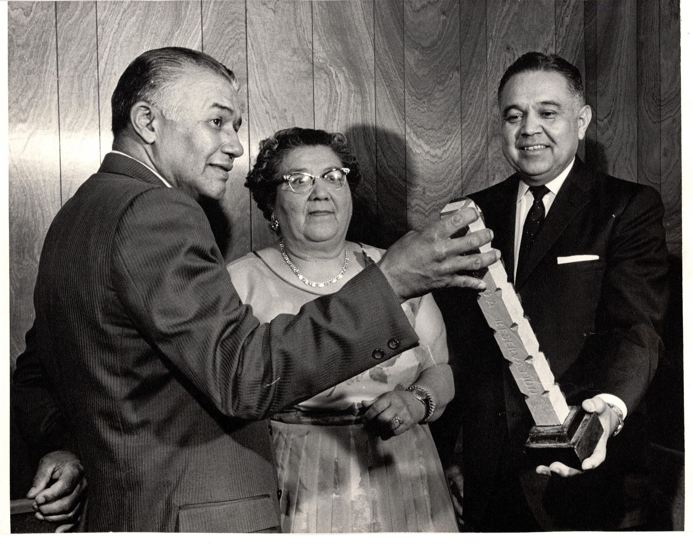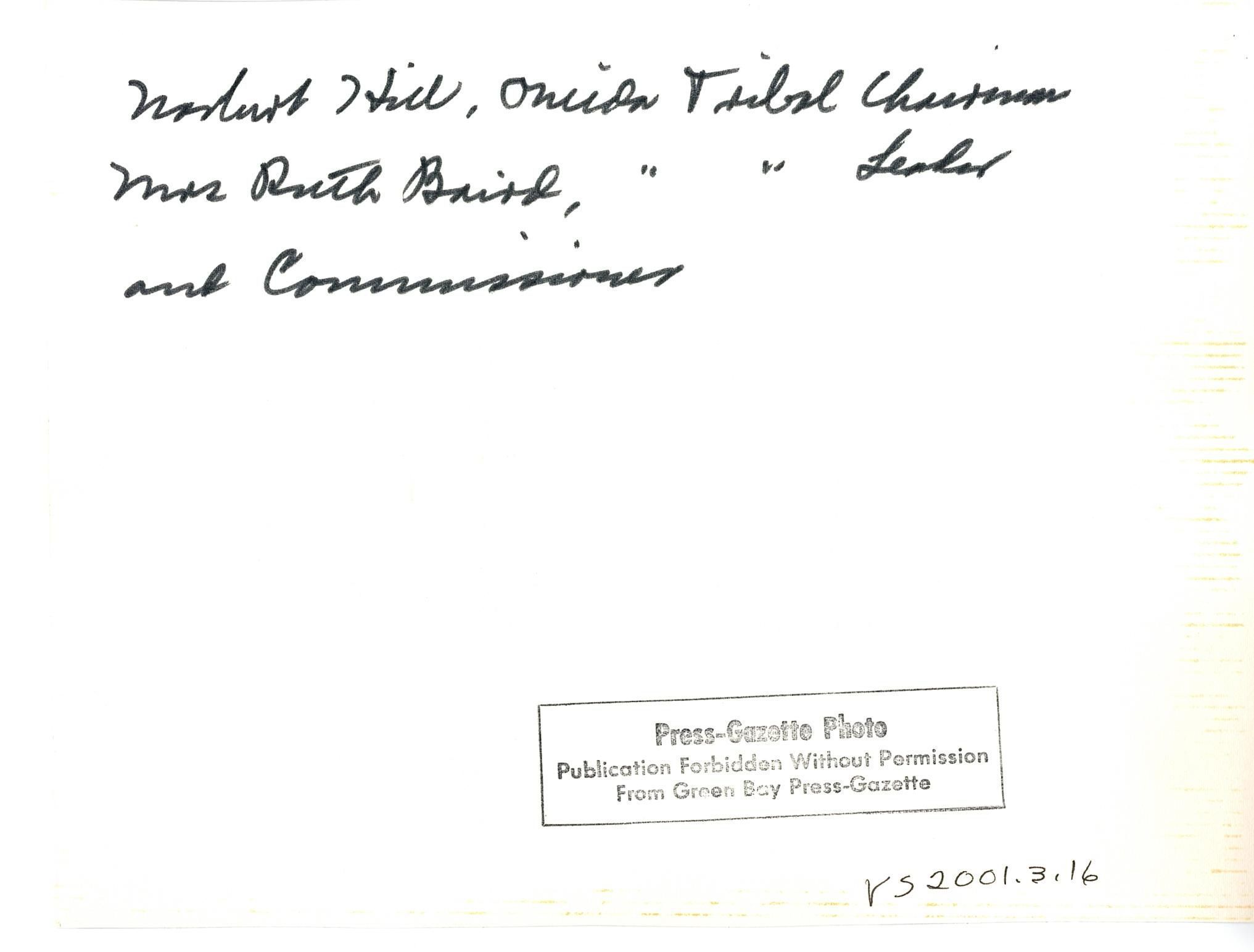 Black and white photograph of Robert Bennett with two other individuals holding a statue/award. Bennett is on the far right, middle is a woman in a dress (Ruth Baird), and on the left is another man (Norbert Hill) holding the top of the statue. Written in black ink on the back "Norbert Hill, Oneida Tribal Chairman; Mrs. Ruth Baird, Oneida Tribal Leader; and Commissioner."Photograph Details
