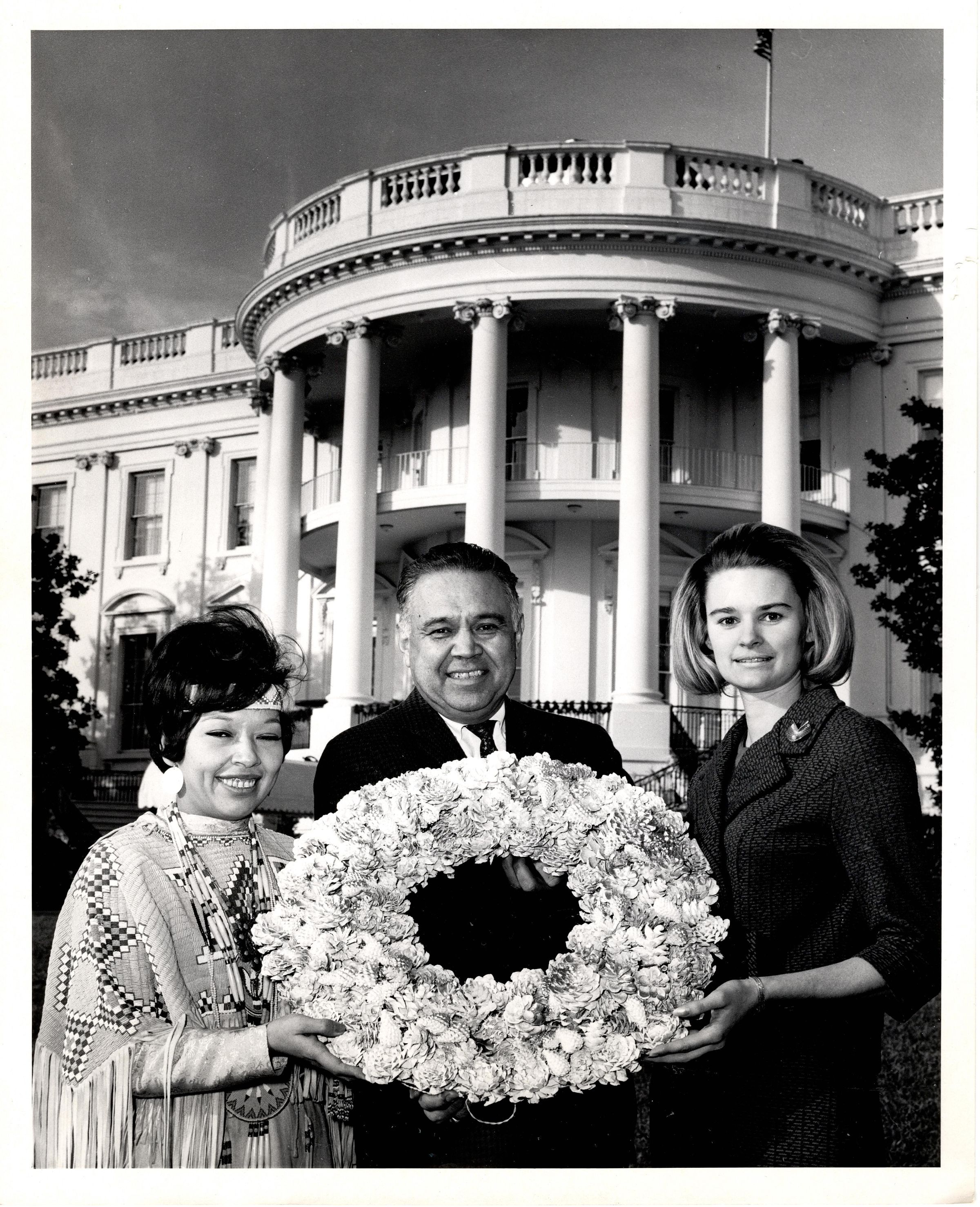 Black and white photograph of Robert Bennett standing between two woman in front of the White House, Washington, D.C. They are holding a large floral wreath. The woman to Bennett's right is wearing a beaded buckskin dress.Photograph Details
