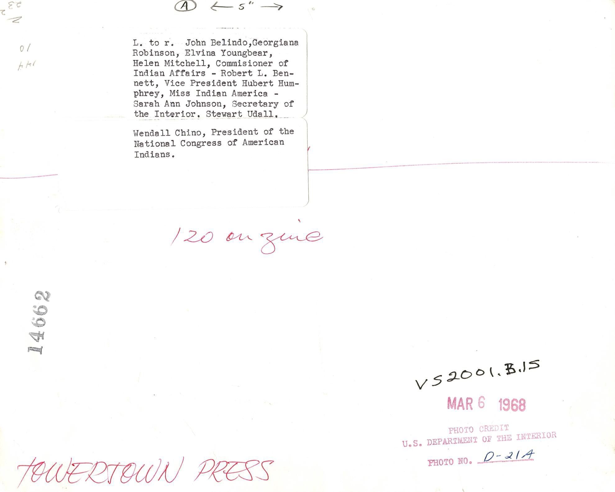 Black and white photograph of nine (9) individuals standing shoulder to shoulder in an office. Robert Bennett is fifth from the left, standing next to Vice President, Hubert Humphrey. Typed on the back "L. to r. John Belindo, Georgiana Robinson, Elvina Youngbear, Helen Mitchell, Commissioner of Indian Affairs-Robert L. Bennett, Vice President Hubery Humphrey, Miss Indian America-Sarah Ann Johnson, Secretary of the Interior, Stewart Udall. Wendall Chino, President of the National Congress of American Indians." Written in red ink on the back "120 on zine" and "Towertown Press".Photograph Details