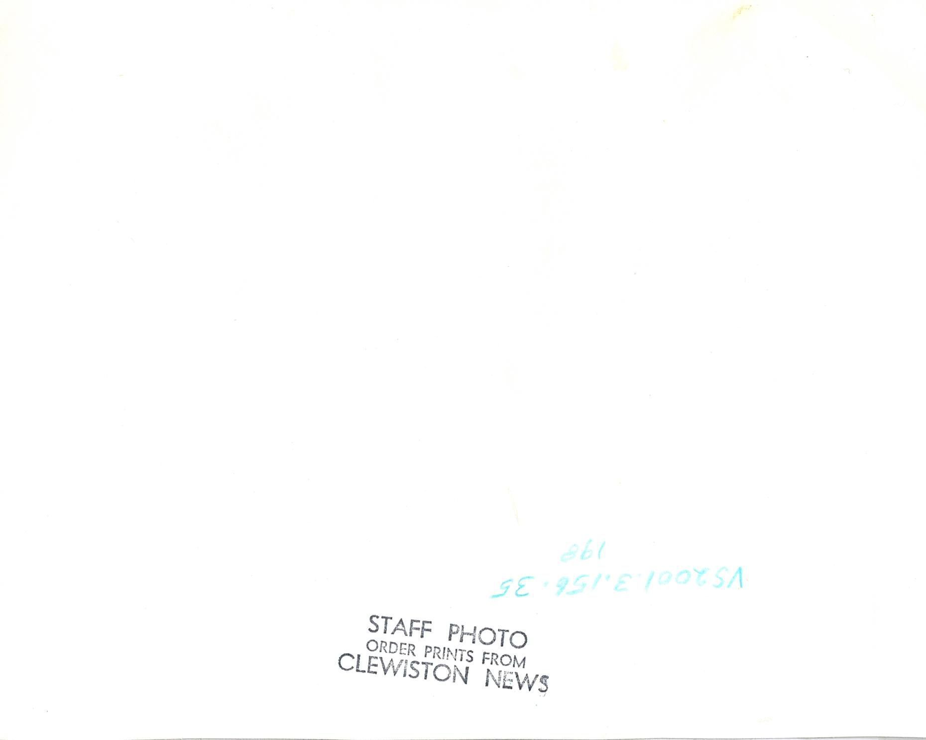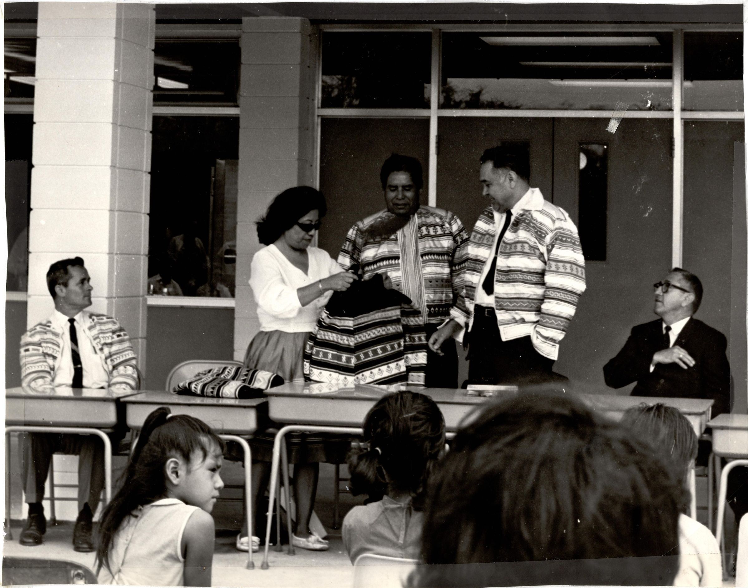 Black and white staff photo of Robert Bennett with three men and a woman handing out printed jackets in front of children. Back of the photo reads "Staff photo, order prints from Clewiston News".Photograph Details