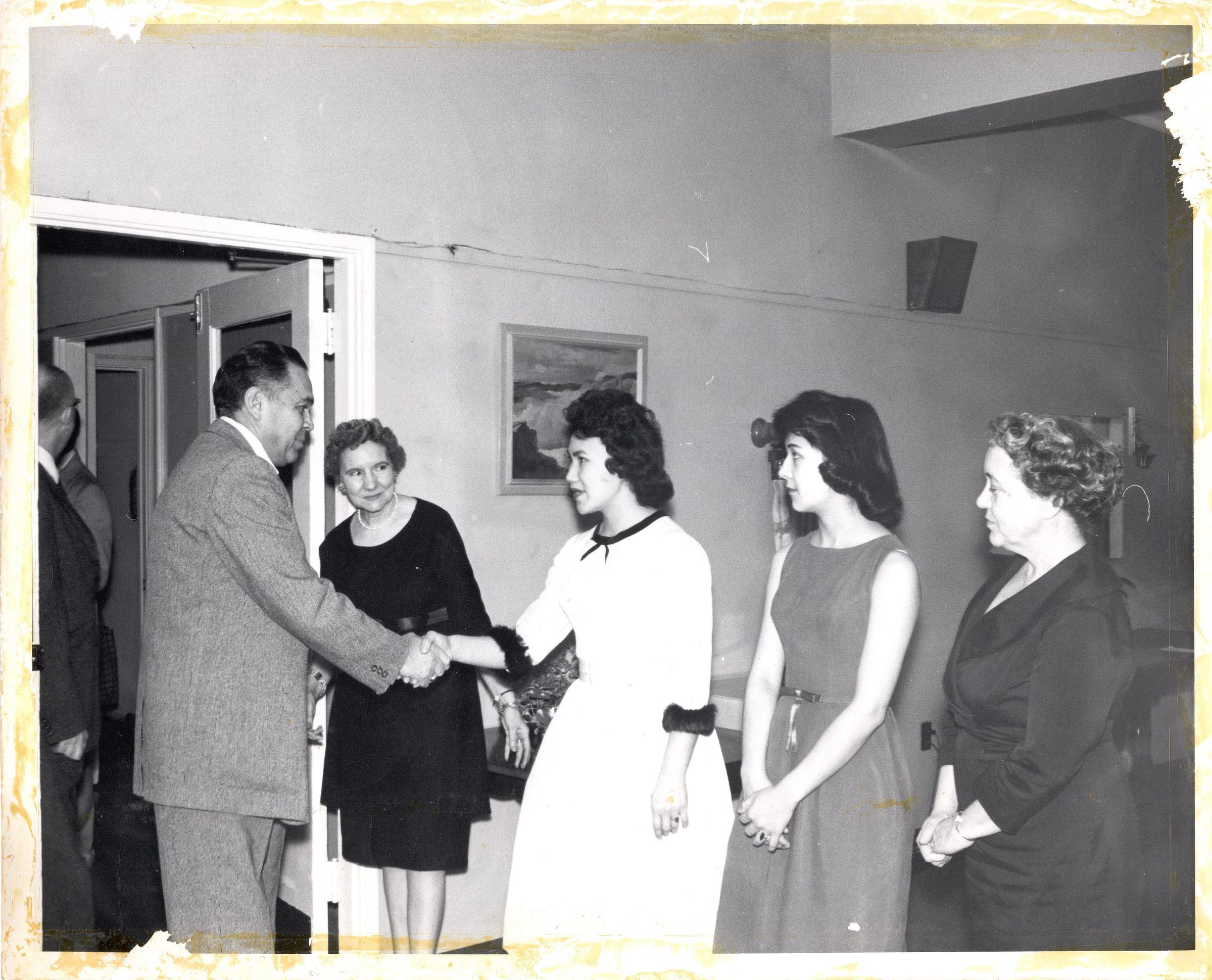 Black and white photograph of Robert Bennett shaking hands with 4 (four) women.Photograph Details