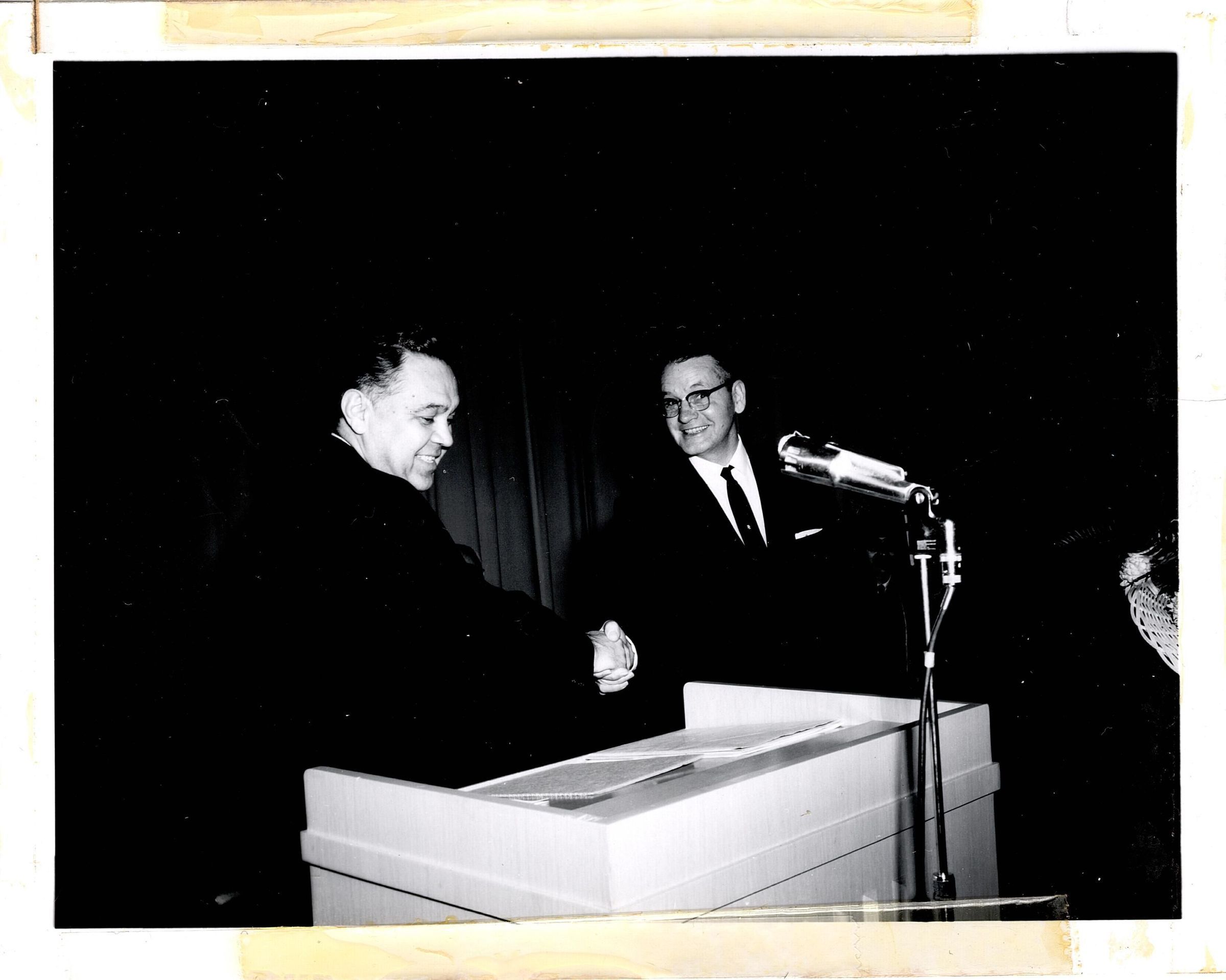 Black and white photograph of Robert Bennett standing behind a podium and microphone, shaking hands with a man who is smiling at the camera. Bennett is looking down at the items on the podium.Photograph Details