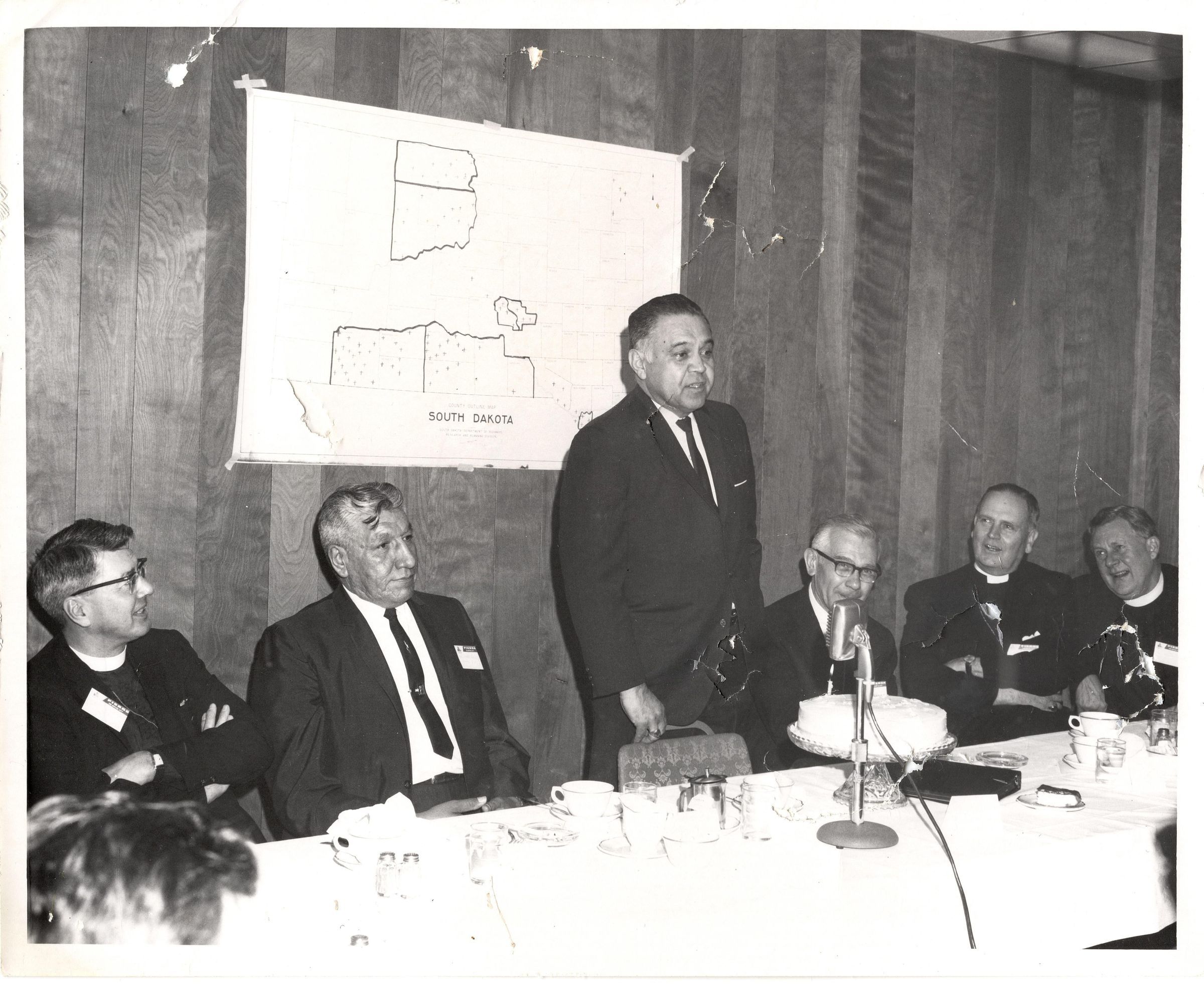 Black and white photograph of Robert Bennett standing and speaking with five other men sitting at a long table with him. There appears to be a cake directly in front of Bennett on the table. Three of the men are Christian leaders with white collars and two of the other men plus Bennett are wearing suits and ties. There is a poster of South Dakota hanging behind Bennett. Typed on the back "Meeting of: National Advisory Committee on American Indian Work of the Episcopal Church at Pierre, South Dakota. April 24-27, 1967. Commissioner Bennett on the occasion of his first anniversary in his office as Commissioner addresses the --" [see condition notes].Photograph Details
