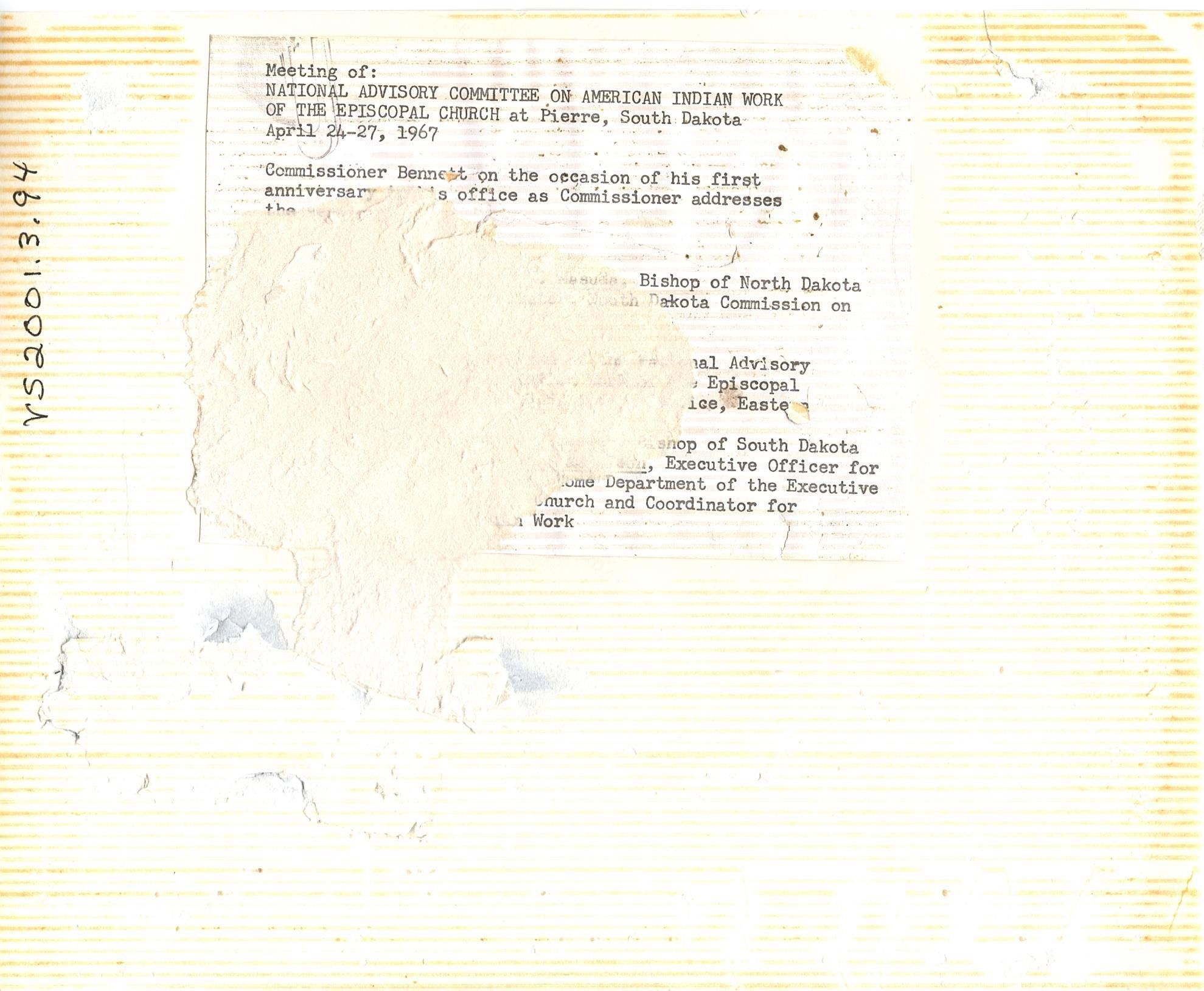 The photo was once glued to something and the typed label on the back is not covered by remnants of the paper it was glued to. Most of the message is now covered. What isn't covered is "-- Bishop of North Dakota -- Dakota Commission on -- Advisory -- Episcopal -- Easte- -- Bishop of South Dakota -- Executive Officer for -- Department of the Executive -- Church and Coordinator for -- Work." Most likely these were all the names of the individuals identified in the photo and their titles.Created By