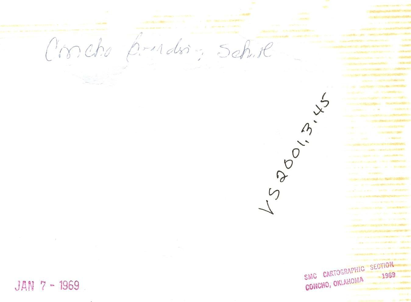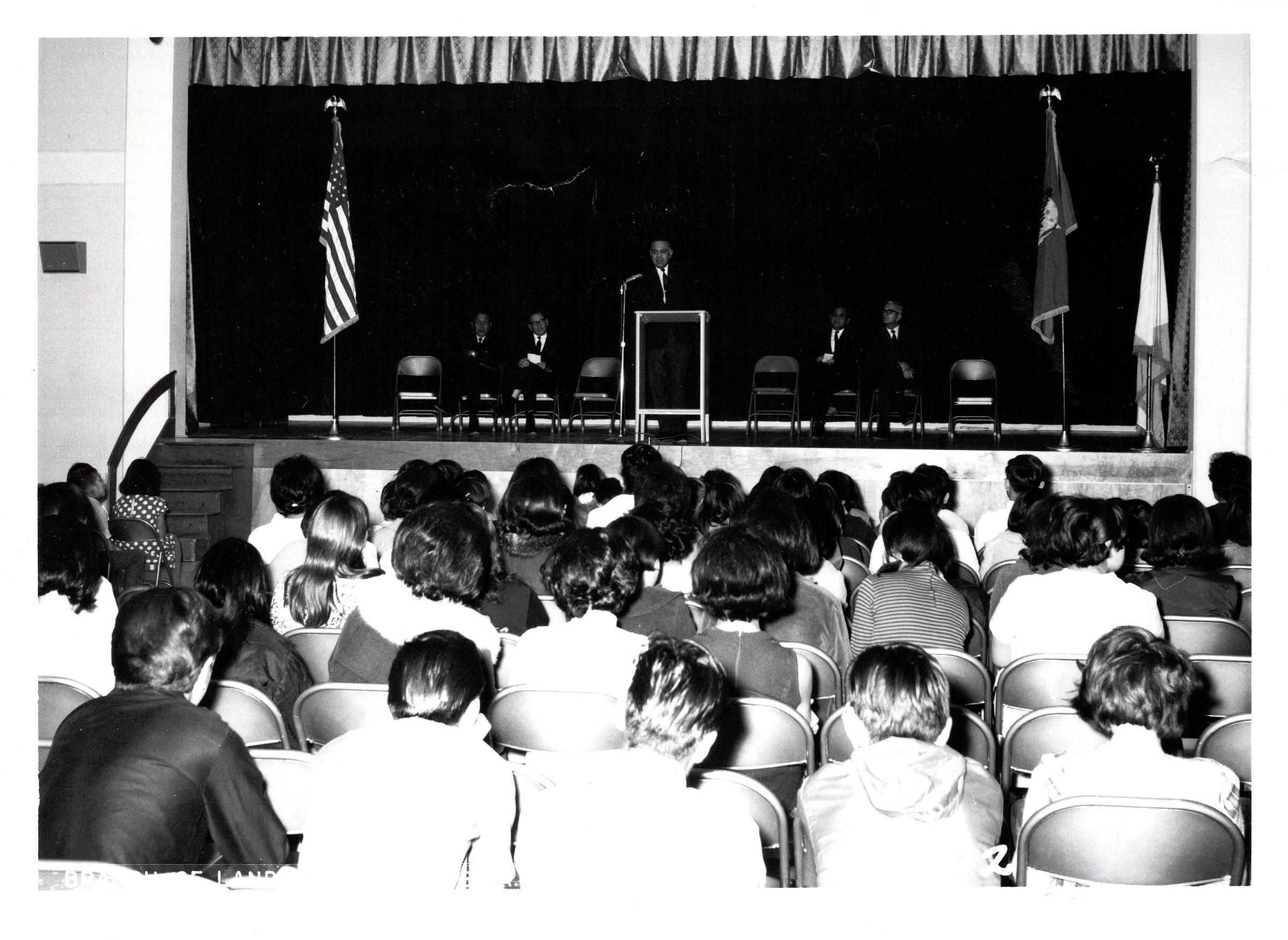 Black and white photograph of an auditorium full of kids and a stage in the background with eight chairs, four men sitting on chairs and Robert Bennett standing behind the podium speaking. Written faintly on the back "Concho boarding school".Photograph Details