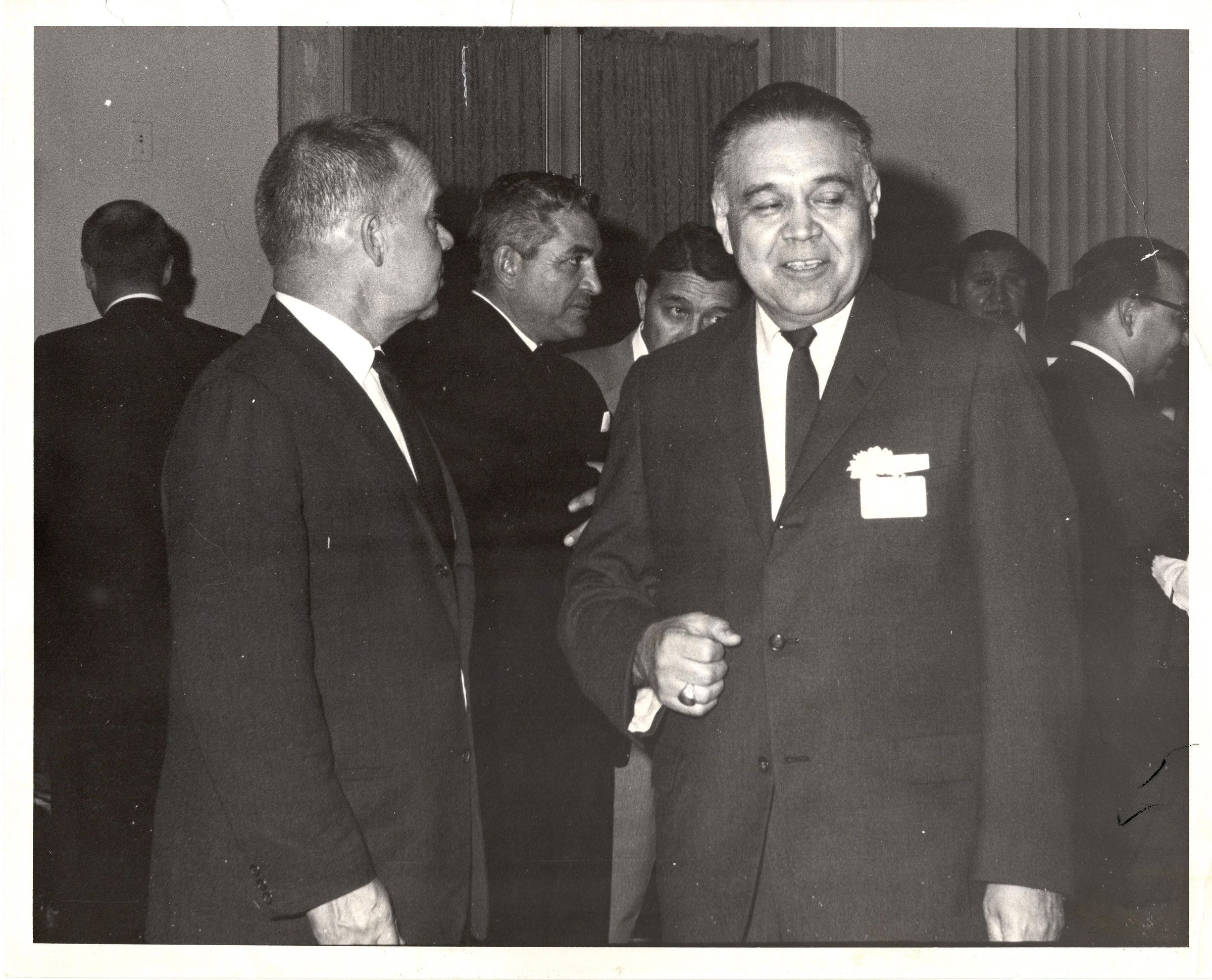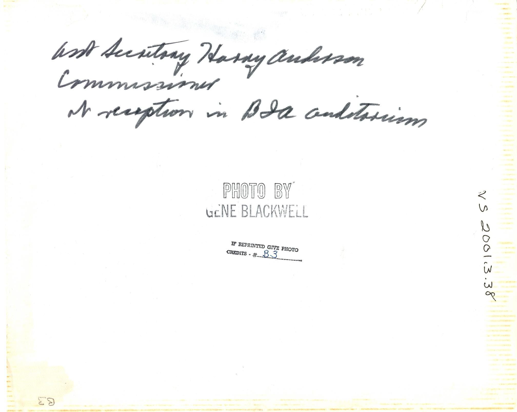 Black and white photo of Robert Bennett standing and smiling at something off camera with a crowd of men behind him. Written in ink on the back "Asst Secretary Harry Anderson; Commissioner; at reception in BIA Auditorium".Photograph Details