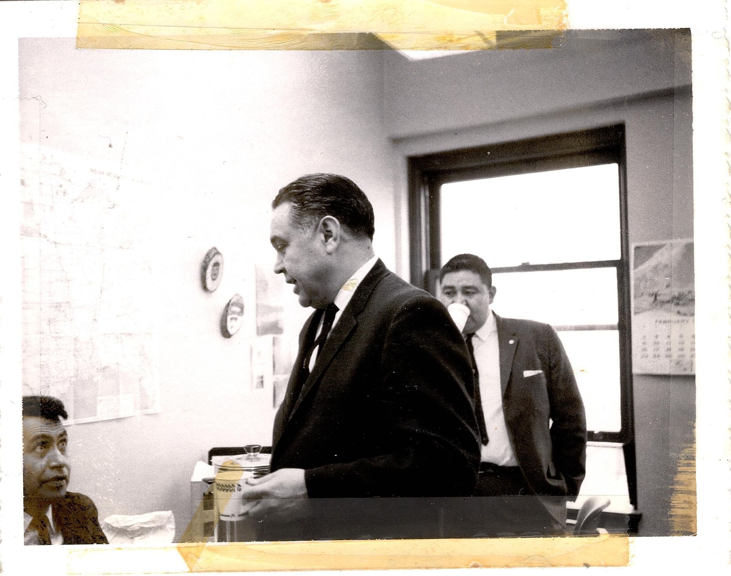 Black and white photograph of Robert Bennett holding a cup of coffee, talking to a man sitting. There is also a man sipping a cup of coffee behind Robert Bennett.Photograph Details