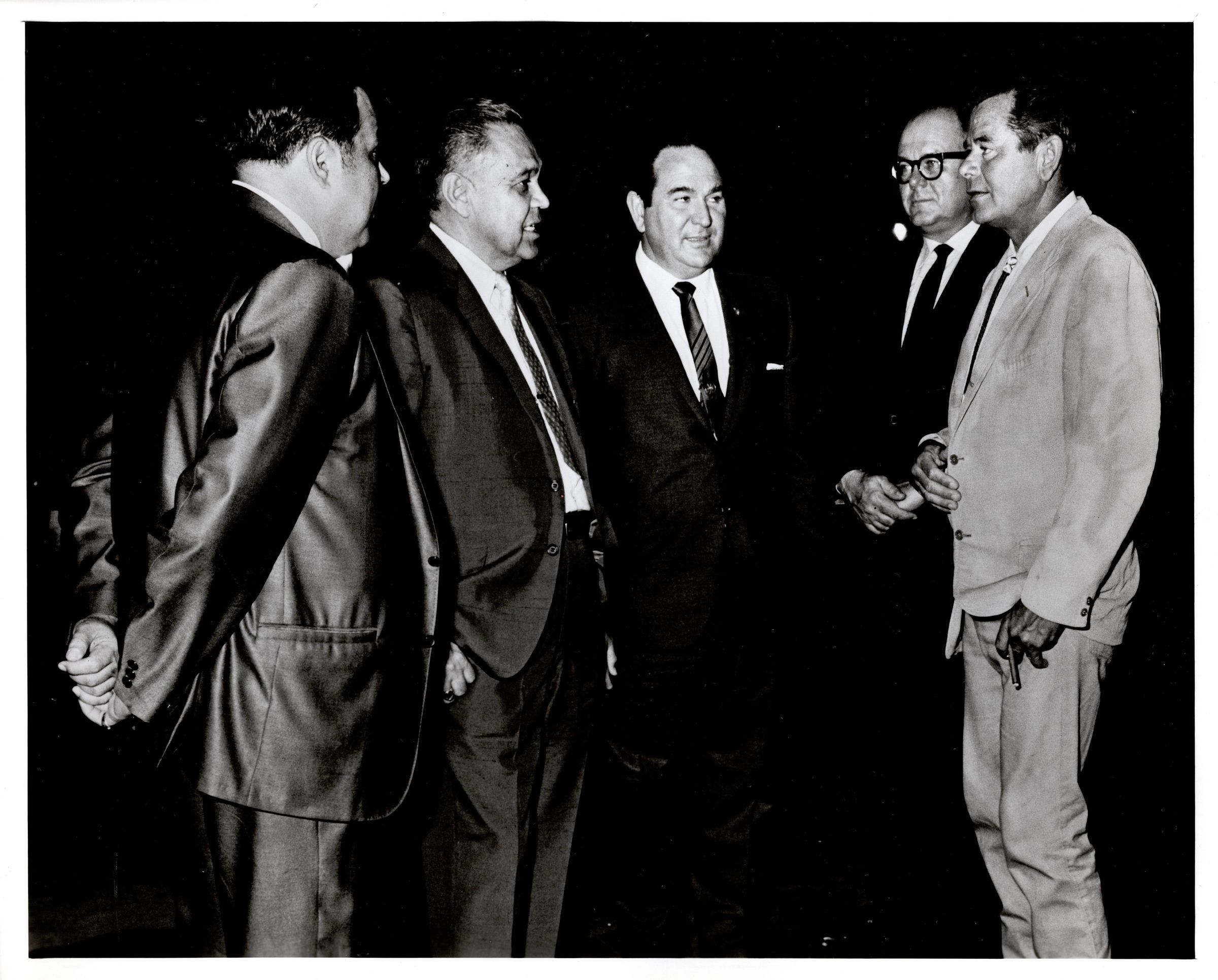Black and white photograph of five men standing, talking to one another. Second man from the left is Robert Bennett. Written in blue ink on the back "Joe Merdler, Robert L. Bennett, Fred Gabourie, D.L. Mahoney, Glenn Ford."Photograph Details