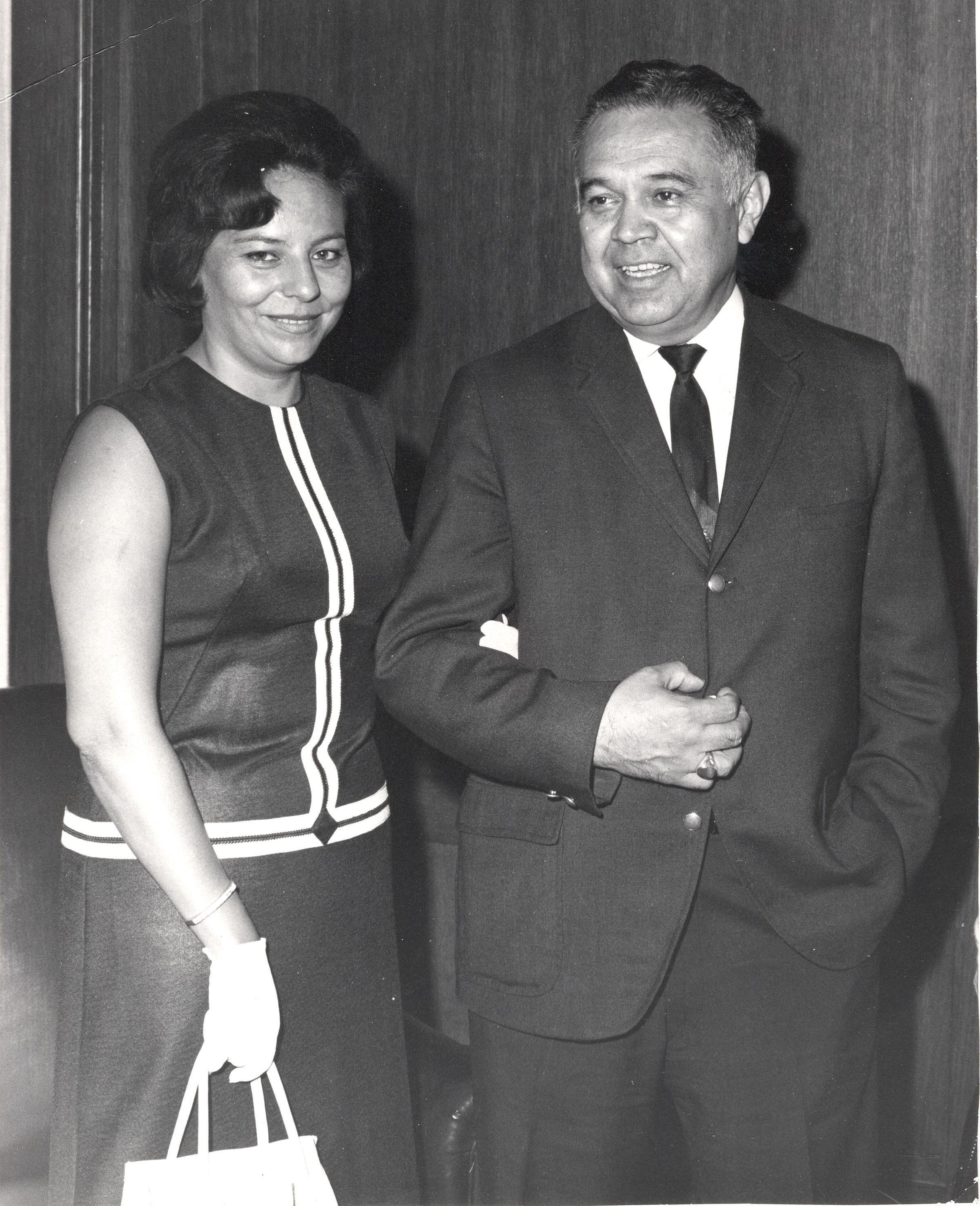 Black and white photograph of Robert Bennett in a suit and tie escorting an unknown woman (possibly Cleota Bennett) wearing a dark sleeveless dress with light parallel lined trim across her waist and down the center of the front.Photograph Details