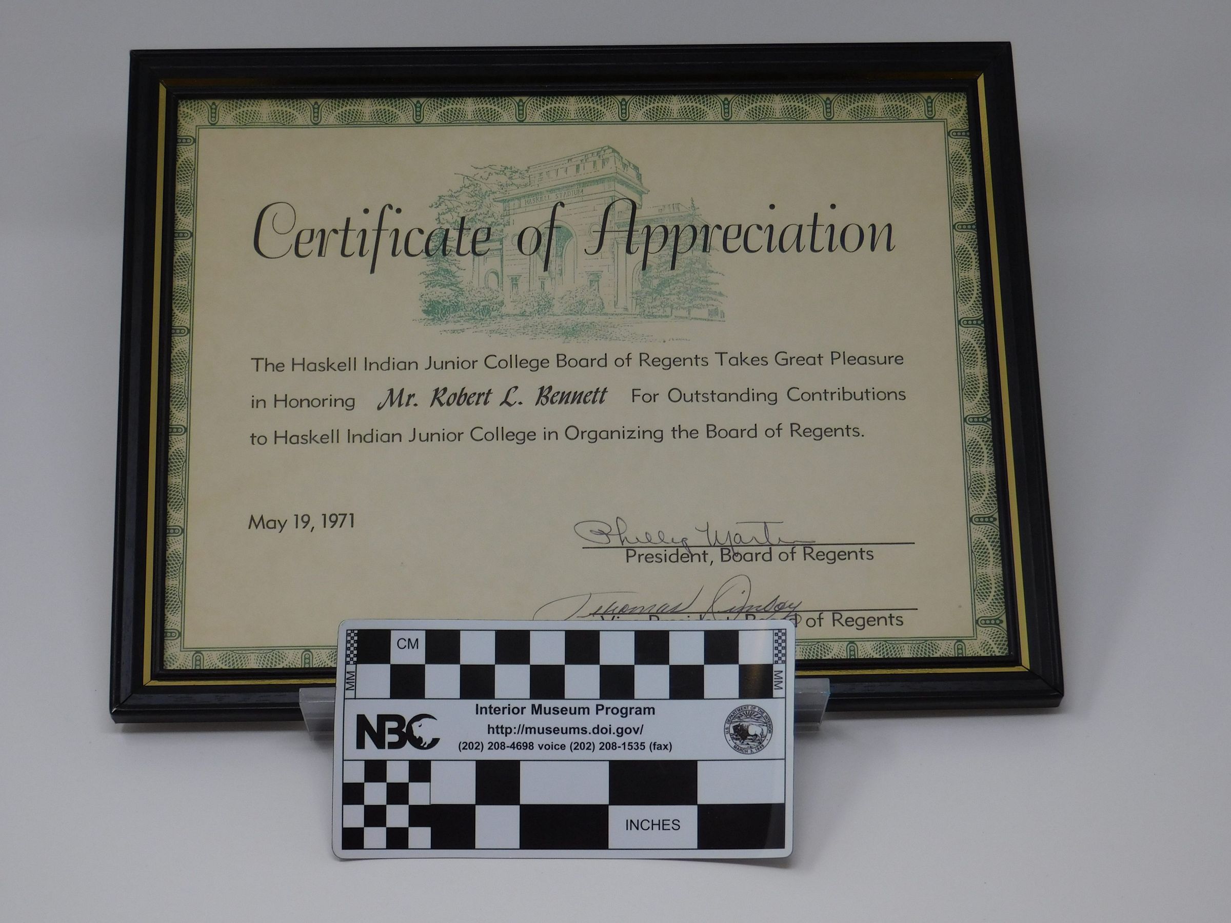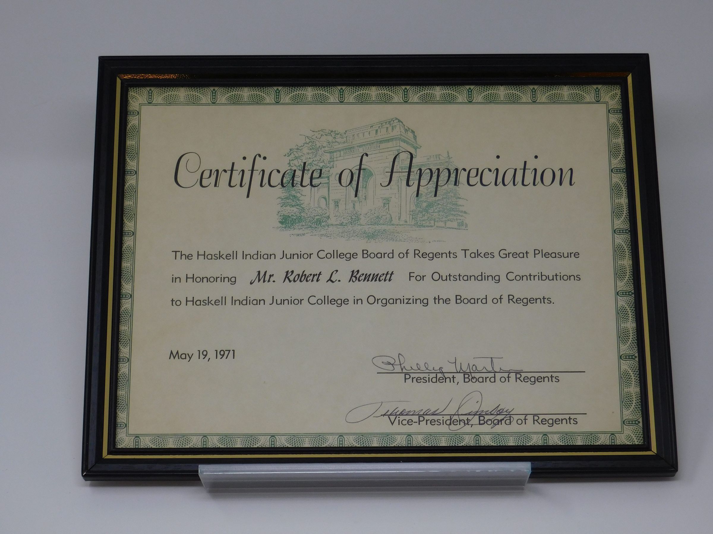 Framed certificate in black with green decorative border and an arch pictured in the middle. It reads "Certificate of Appreciation, The Haskell Indian Junior College Board of Regents Takes Great Pleasure in Honoring Mr. Robert L. Bennett For Outstanding Contributions to Haskell Indian College in Organizing the Board of Regents" dated May 19, 1971.Collection
