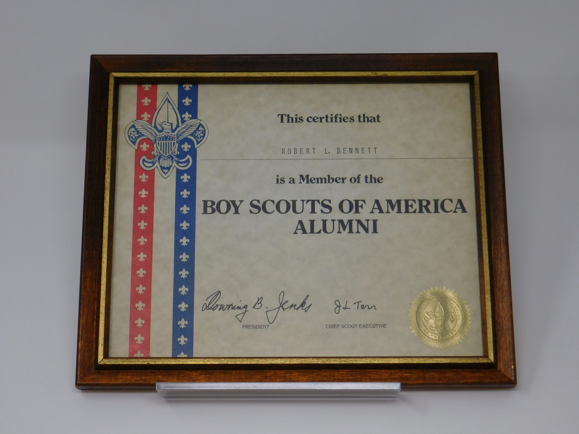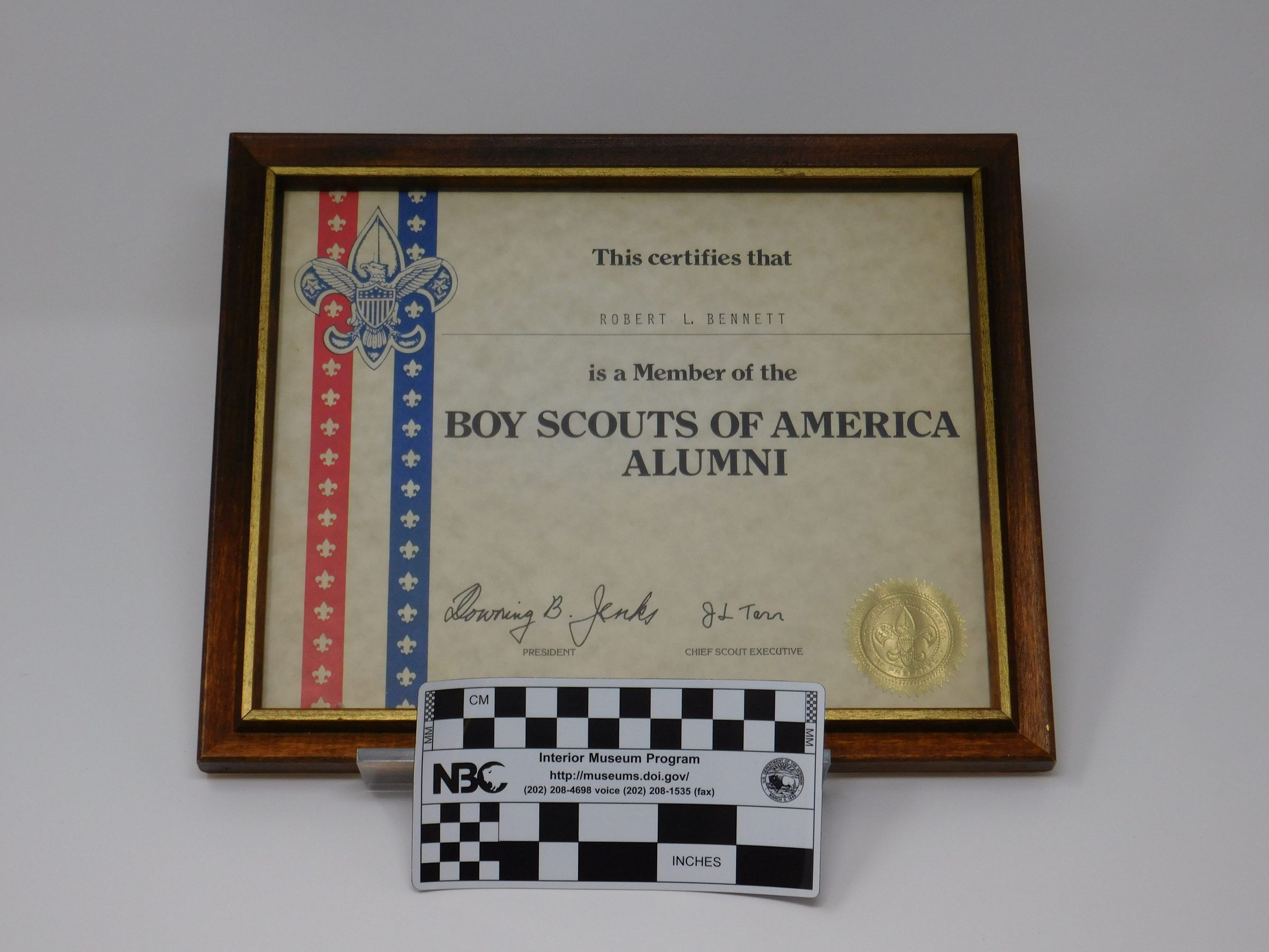 Framed certificate that reads "This certifies that Robert L. Bennett is a Member of the Boy Scouts of America Alumni" with two strips of fleur de lis (one red and one blue) and a large fleur de lis in the top left corner along with a gold seal in the bottom right corner.Collection