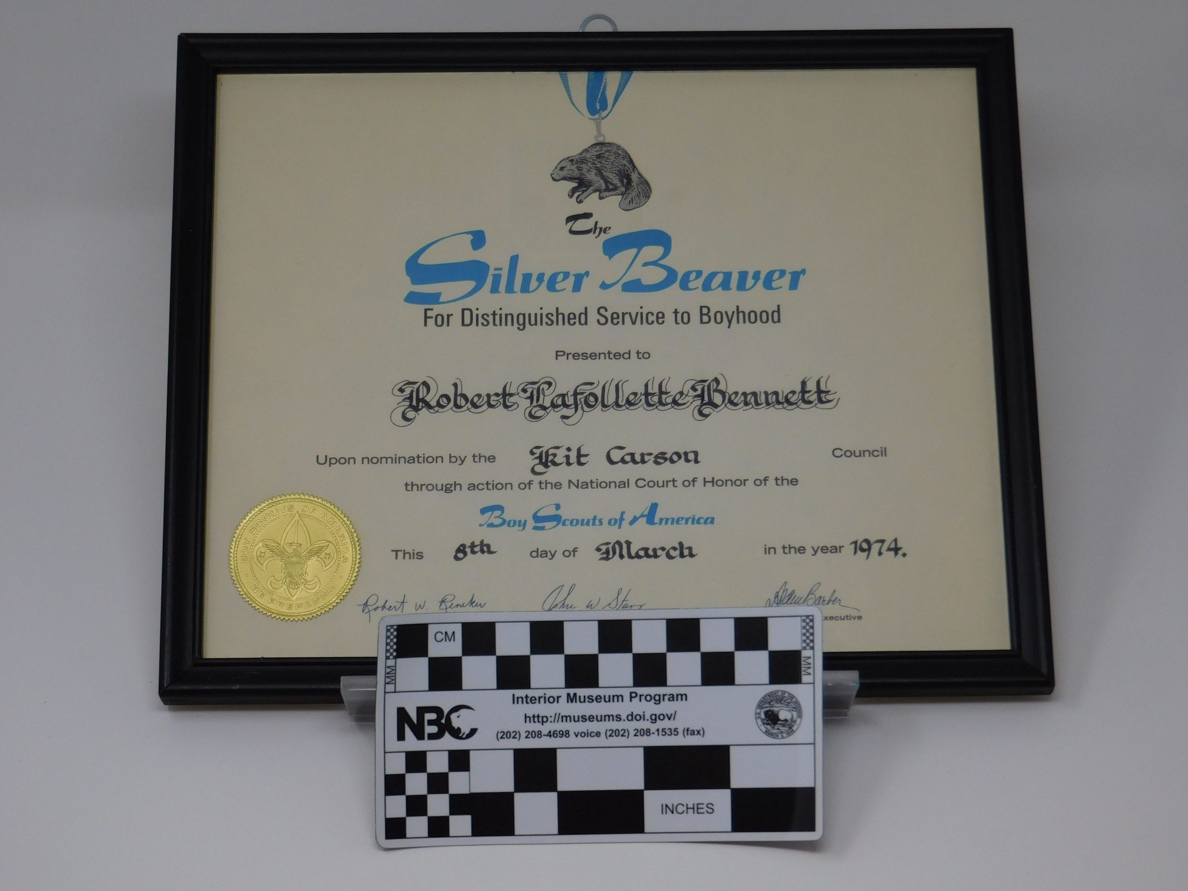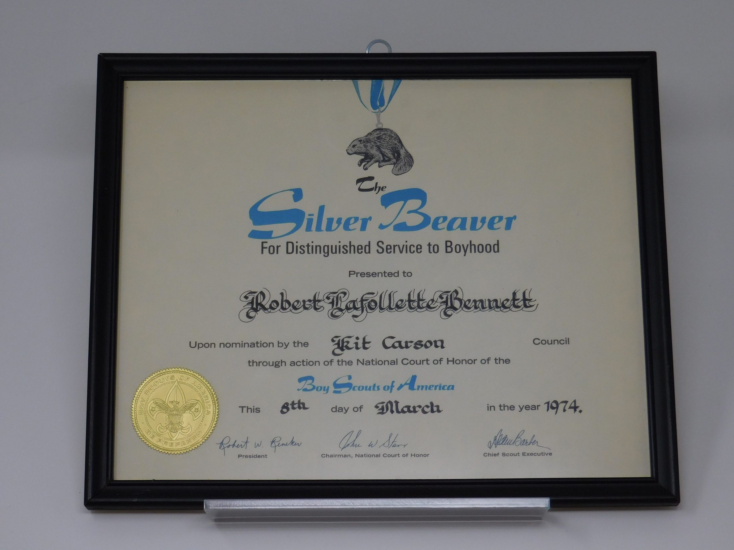 Framed certificate that reads "The Silver Beaver, For Distinguished Service to Boyhood, Presented to Robert LaFollette Bennett Upon nomination by the Kit Carson Council through action of the National Court of Honor of the Boy Scouts of America, This 8th day of March in the year 1974" with a gold seal in the bottom left corner.Collection