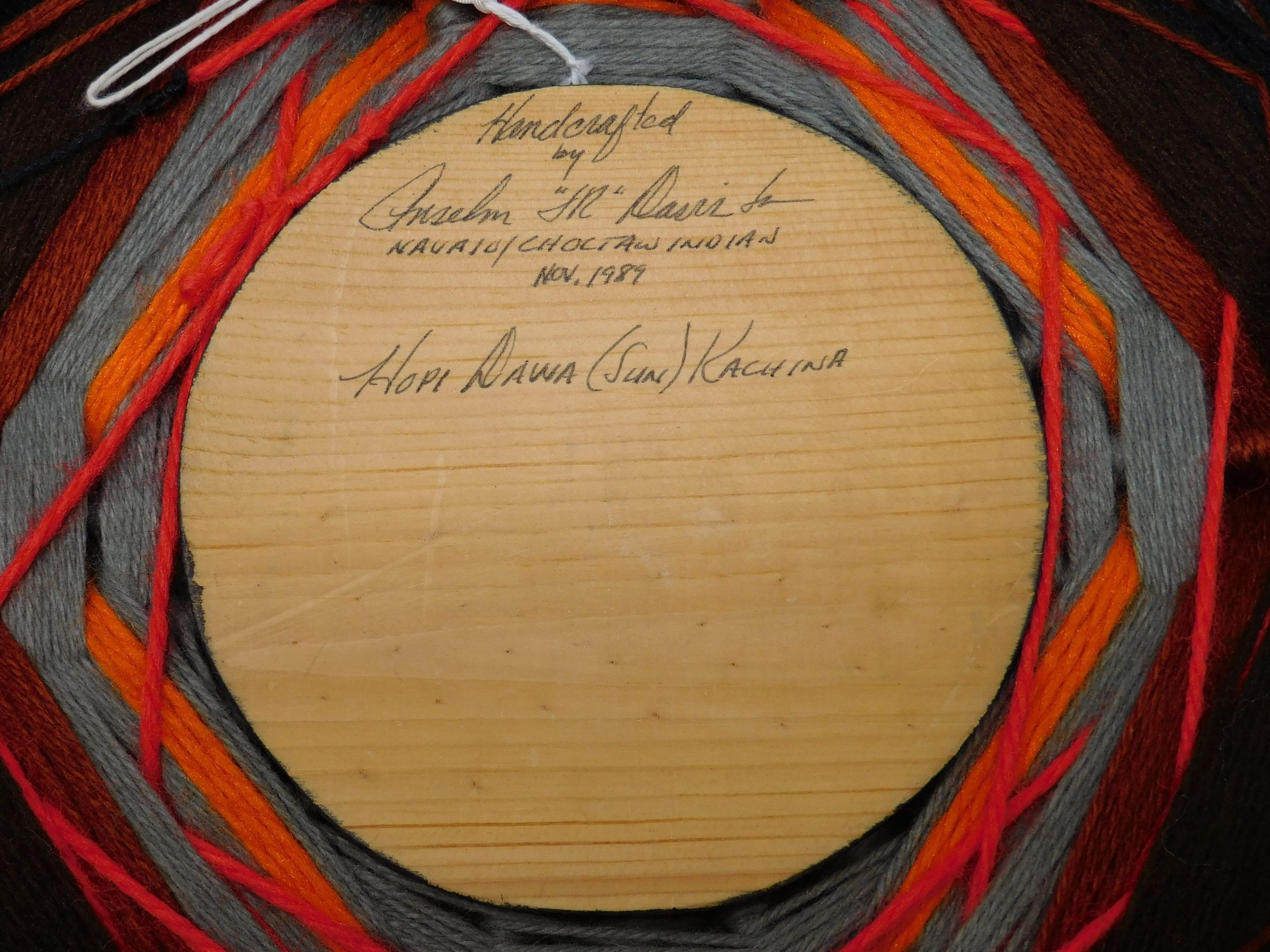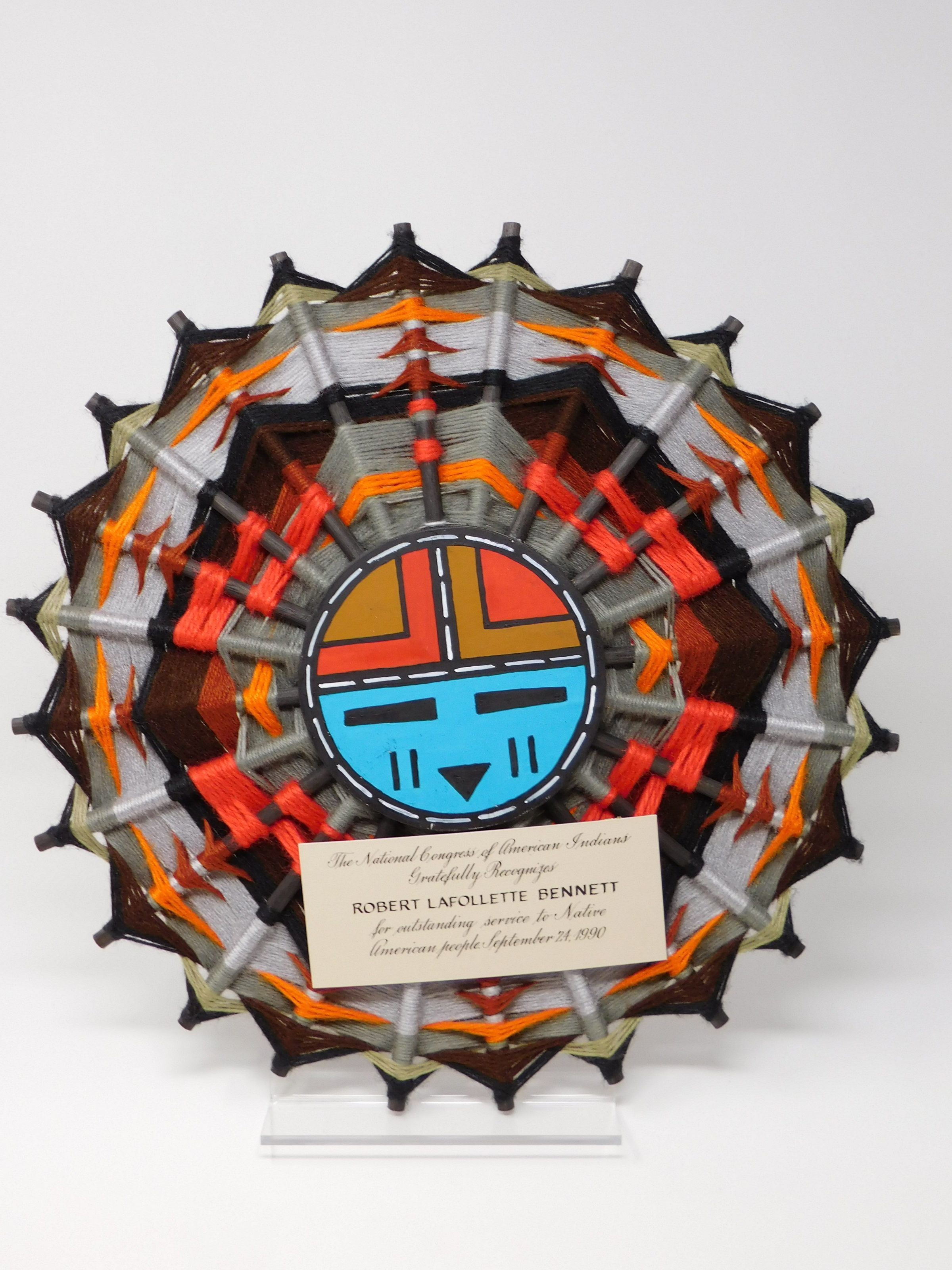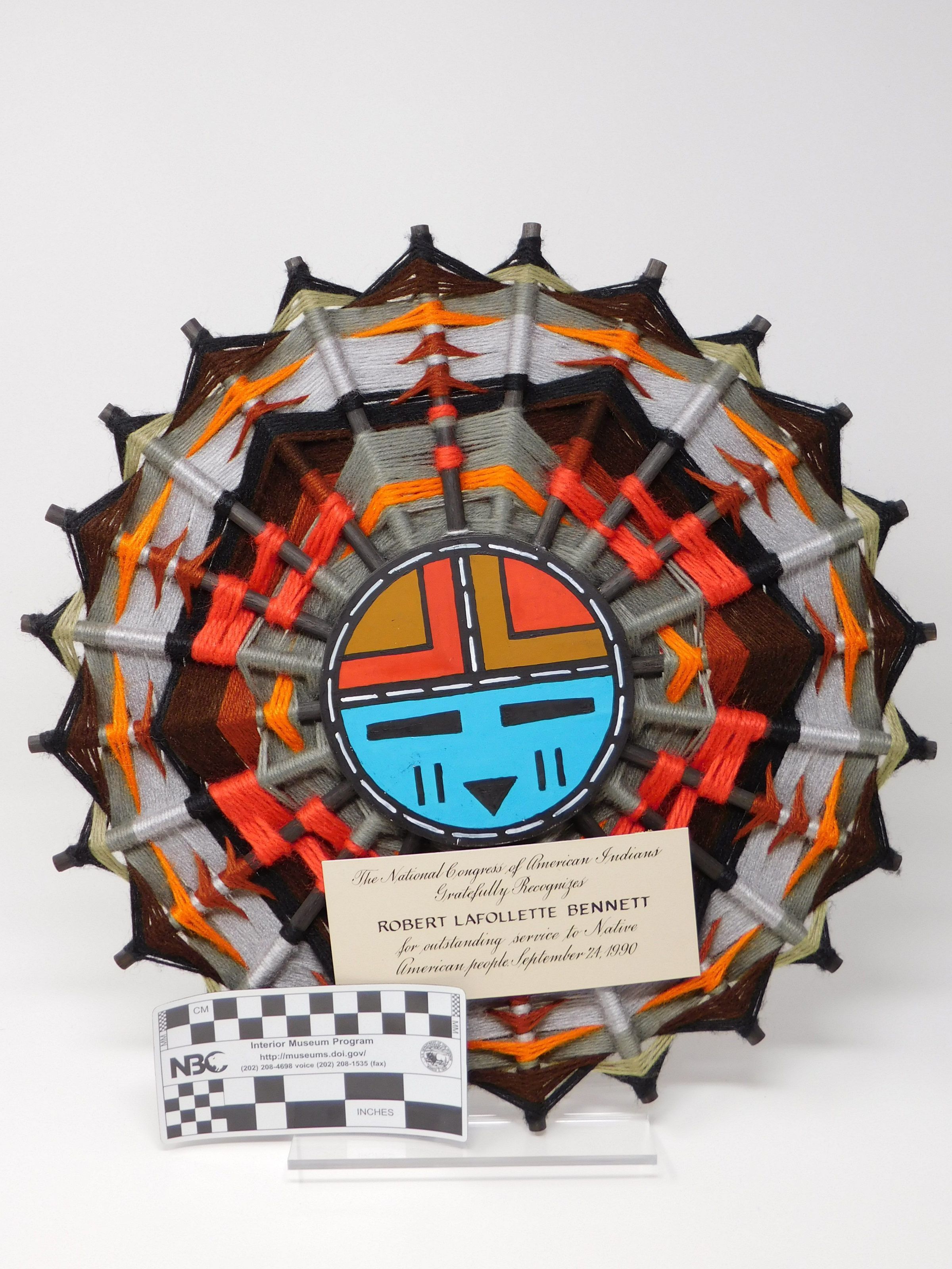 Woven mandala in warm orange and copper colors with black and greys. There is a geometric face (Kachina) in the middle, painted on wood in a light blue color and the copper colors that match the yarn. Beneath it is a wood plaque that reads "The National Congress of American Indians gratefully recognizes Robert LaFollette Bennett for outstanding service for Native American people September 24, 1990". The back of the circle wood face reads "Handcrafted by Anselm "Jr" Davis Jr., Navajo/Choctaw Indian, Nov. 1989, Hopi Dawa (Sun) Kachina".Collection