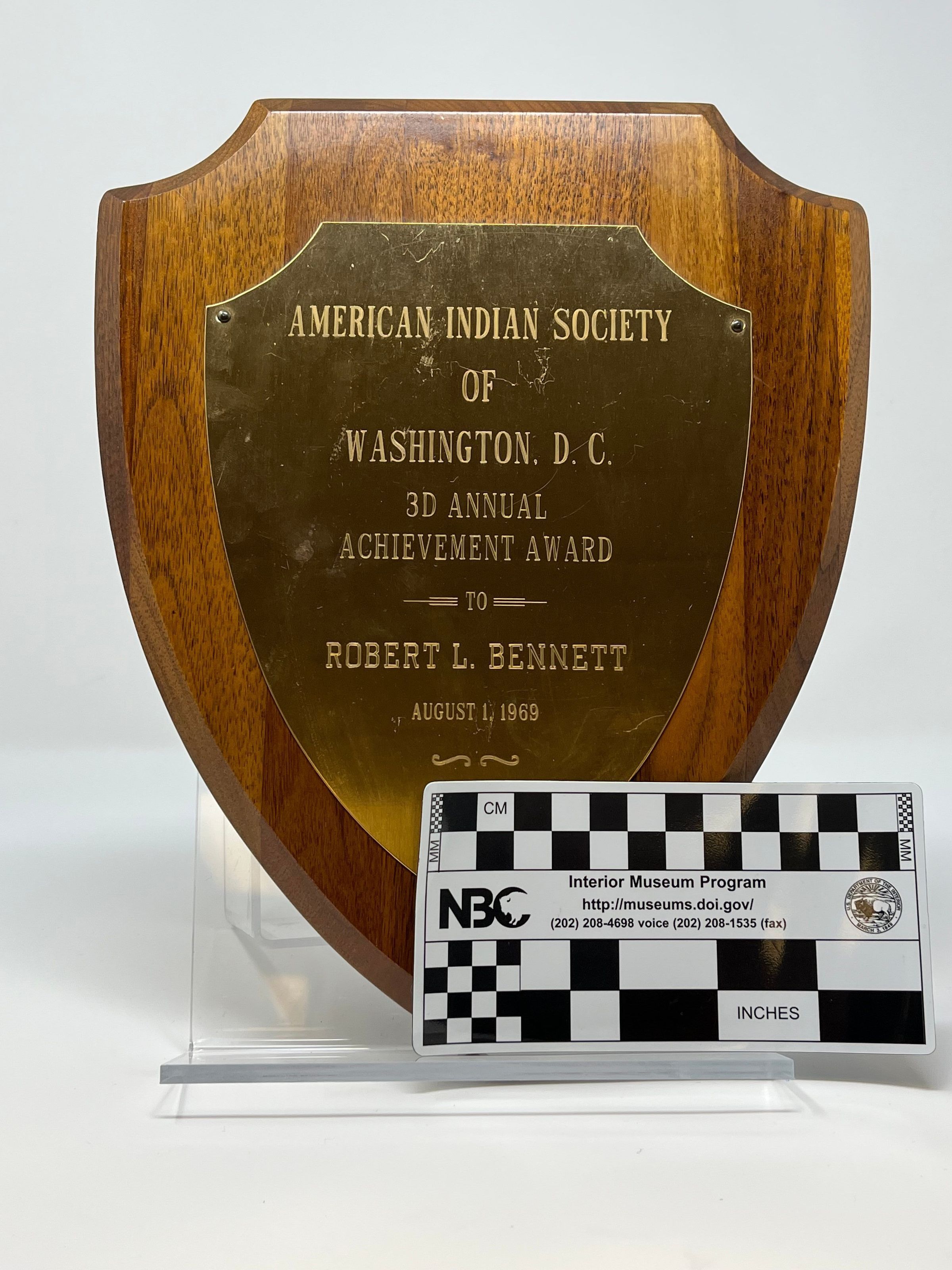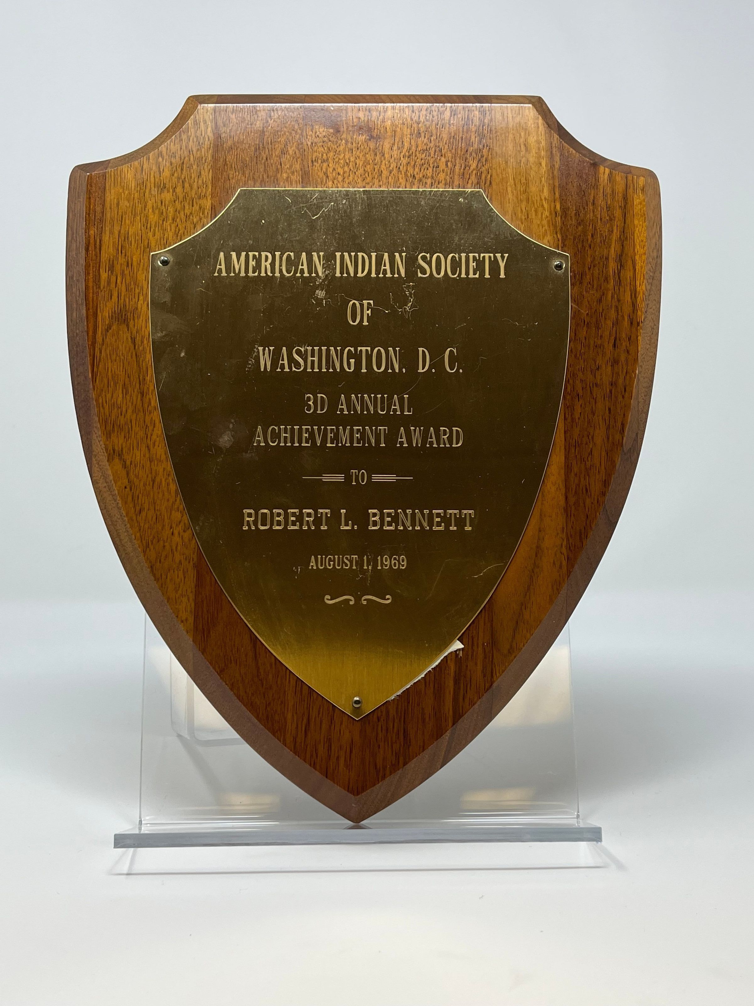 Wooden plaque in the shape of an arrowhead with metal plate attached that reads "American Indian Society of Washington, D.C. 3D Annual Achievement Award to Robert L. Bennett, August 1, 1969".Collection