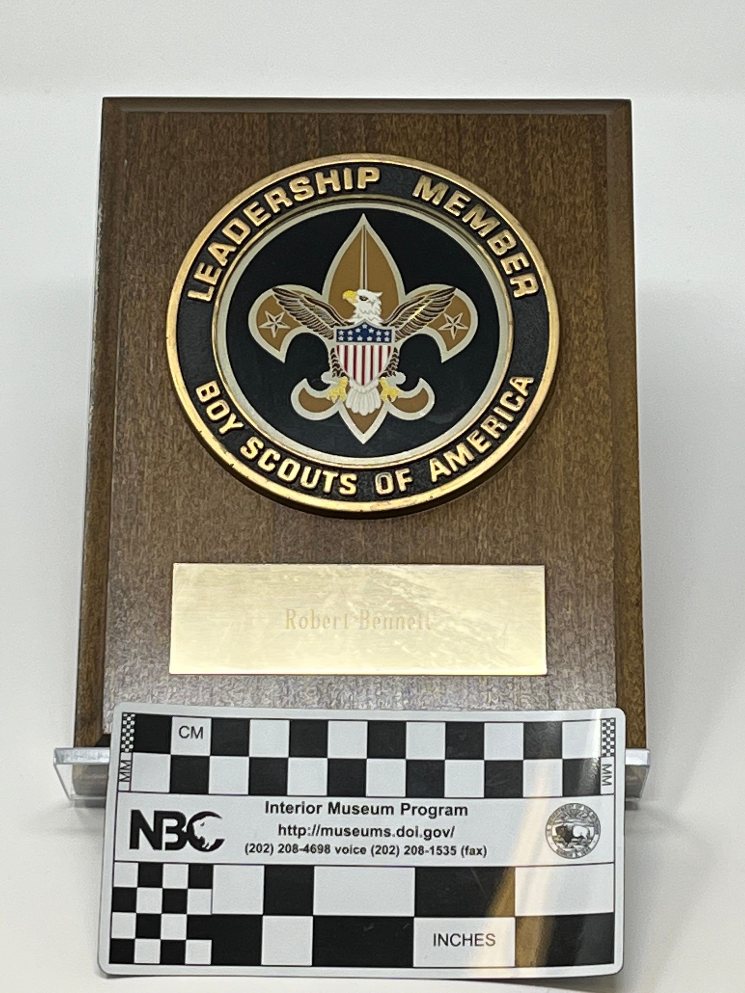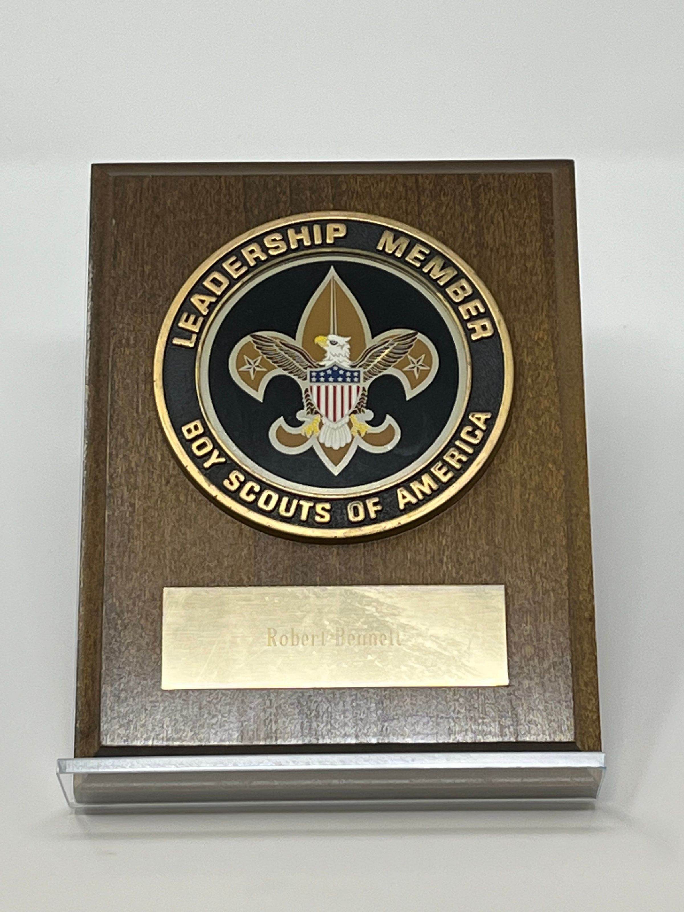 Wooden plaque with plate with eagle and American flag on a fleur de lis and two stars attached that reads "Leadership Member Boy Scouts of America". On the bottom is another gold plate with "Robert Bennett" inscribed on it.Collection