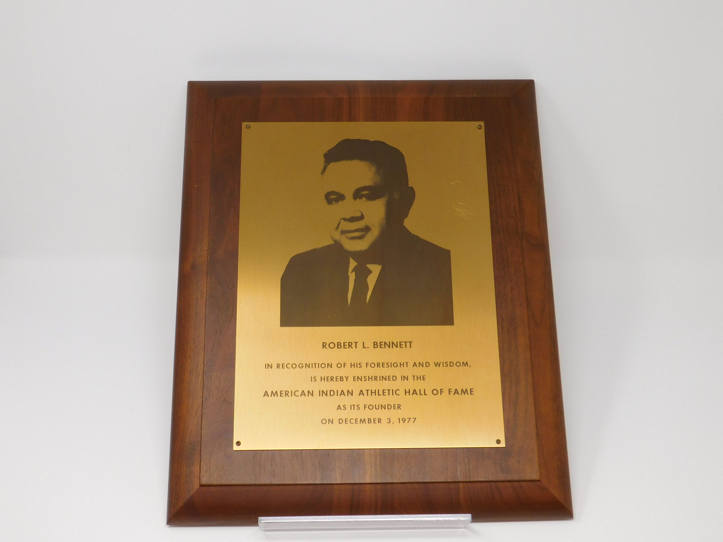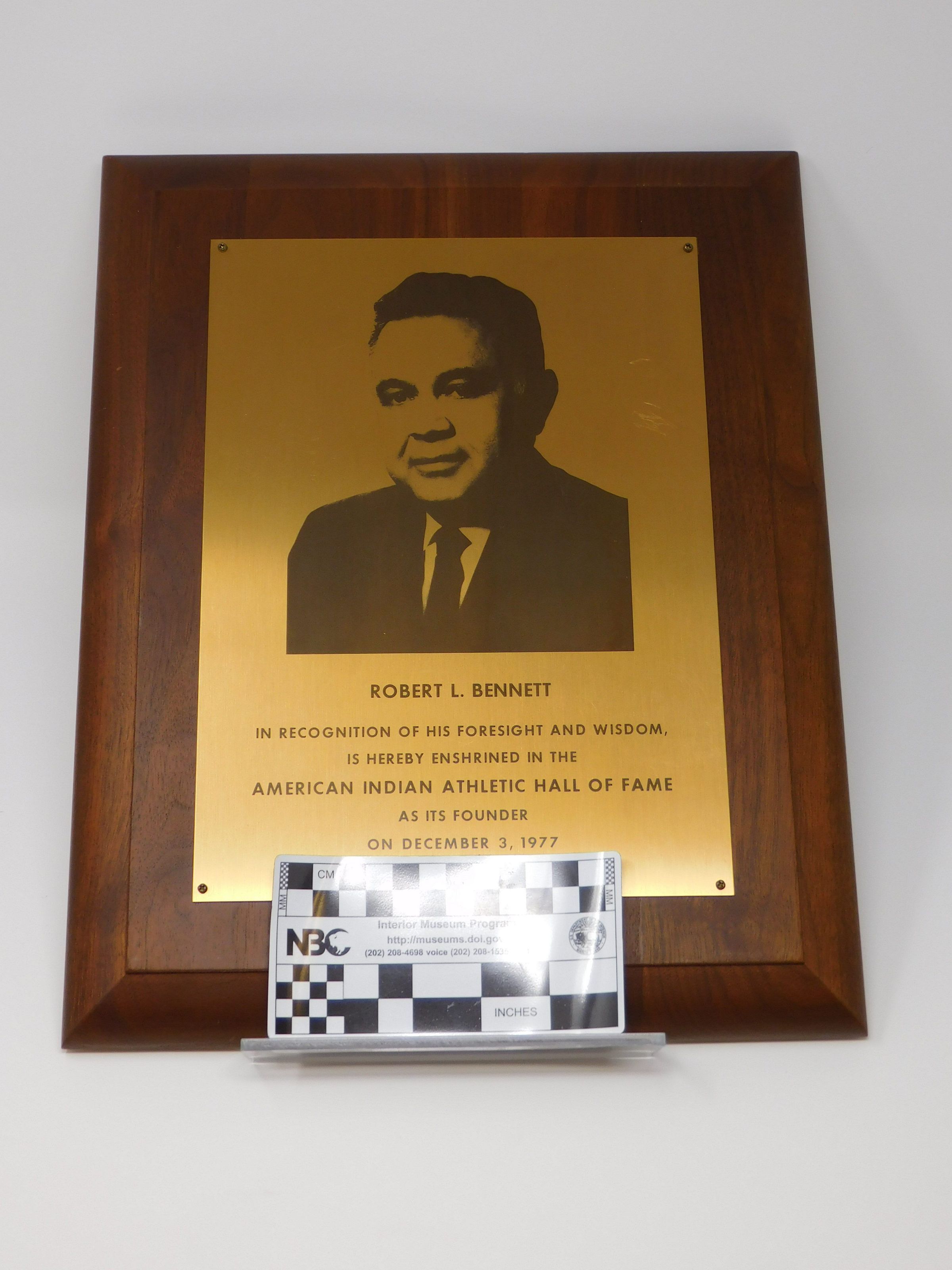 Wooden plaque with gold plate that has an image of Robert Bennett etched into it and "Robert L. Bennet, In recognition of his foresight and wisdom, is hereby enshrined in the American Indian Athletic Hall of Fame as its founder on December 3, 1977".Collection