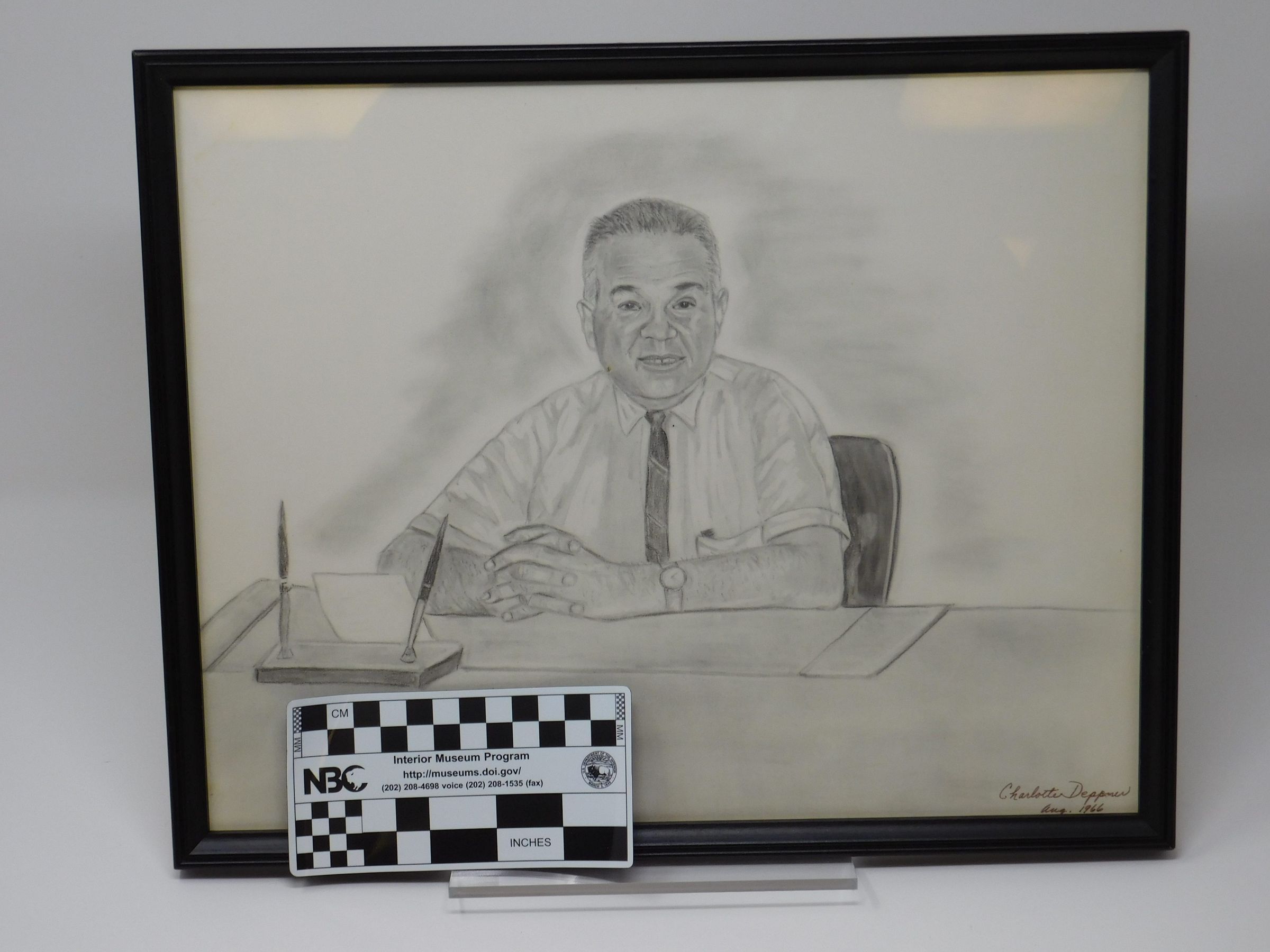 Framed pencil drawing of Robert Bennett sitting at a desk with his hands clasped in front of him and two pens in a holder. Drawing by Charlotte Deppner, August 1966.Collection