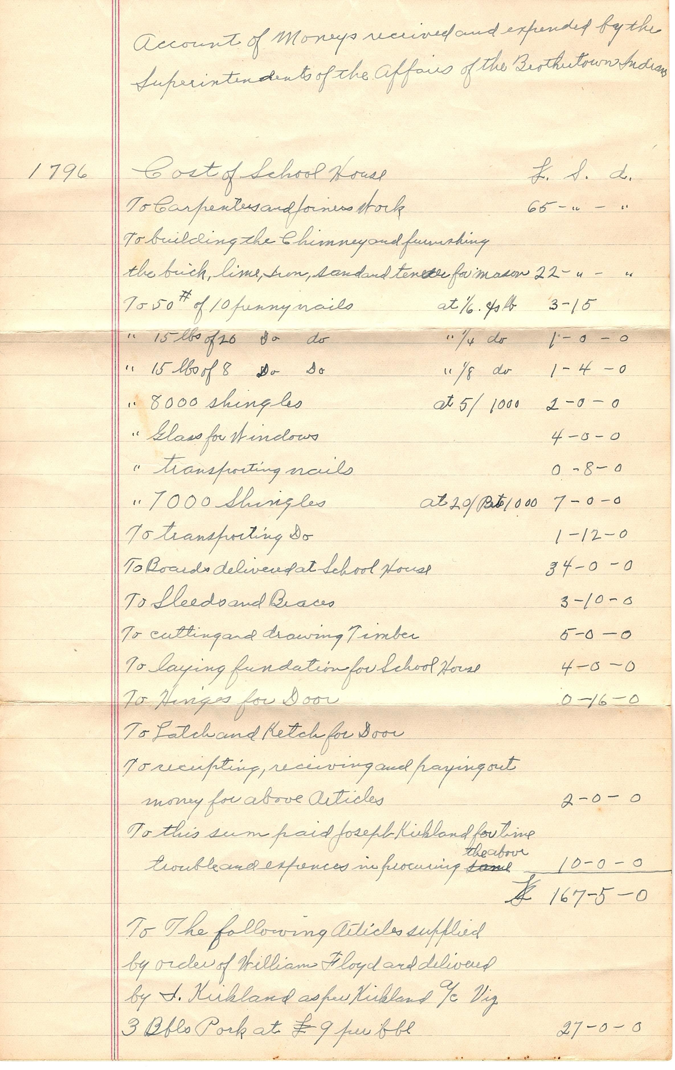 Two loose sheets from a legal sized notepad. Written in ink across the top "Account of Moneys received and expended by the Superintendent of the Affairs of the Brothertown Indians". It is a list of the cost of the school house supplies to build (materials and labor). The paper is folded into thirds.Collection
