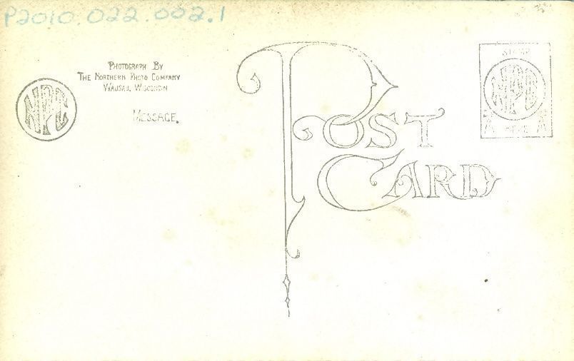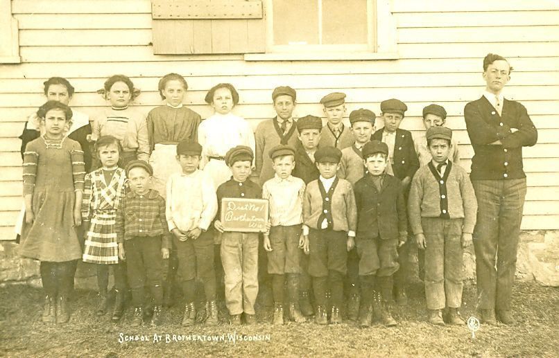 Two identical black and white postcards of a school class. There are 19 students (male and female), ages range from 6 to early teens. One male teacher stands to the left of the students (right on postcard) wearing a sweater and tie with arms crossed in front of his chest. All the girls appear to be wearing dresses with nylons and the boys are wearing caps. One boy in the front is holding a chalkboard that reads "Dist No. I Brothertown Wis." and written in white on the bottom of the postcard is "School at Brothertown, Wisconsin". The class is standing in front of a building with light siding and one wood shutter next to the window.Collection
