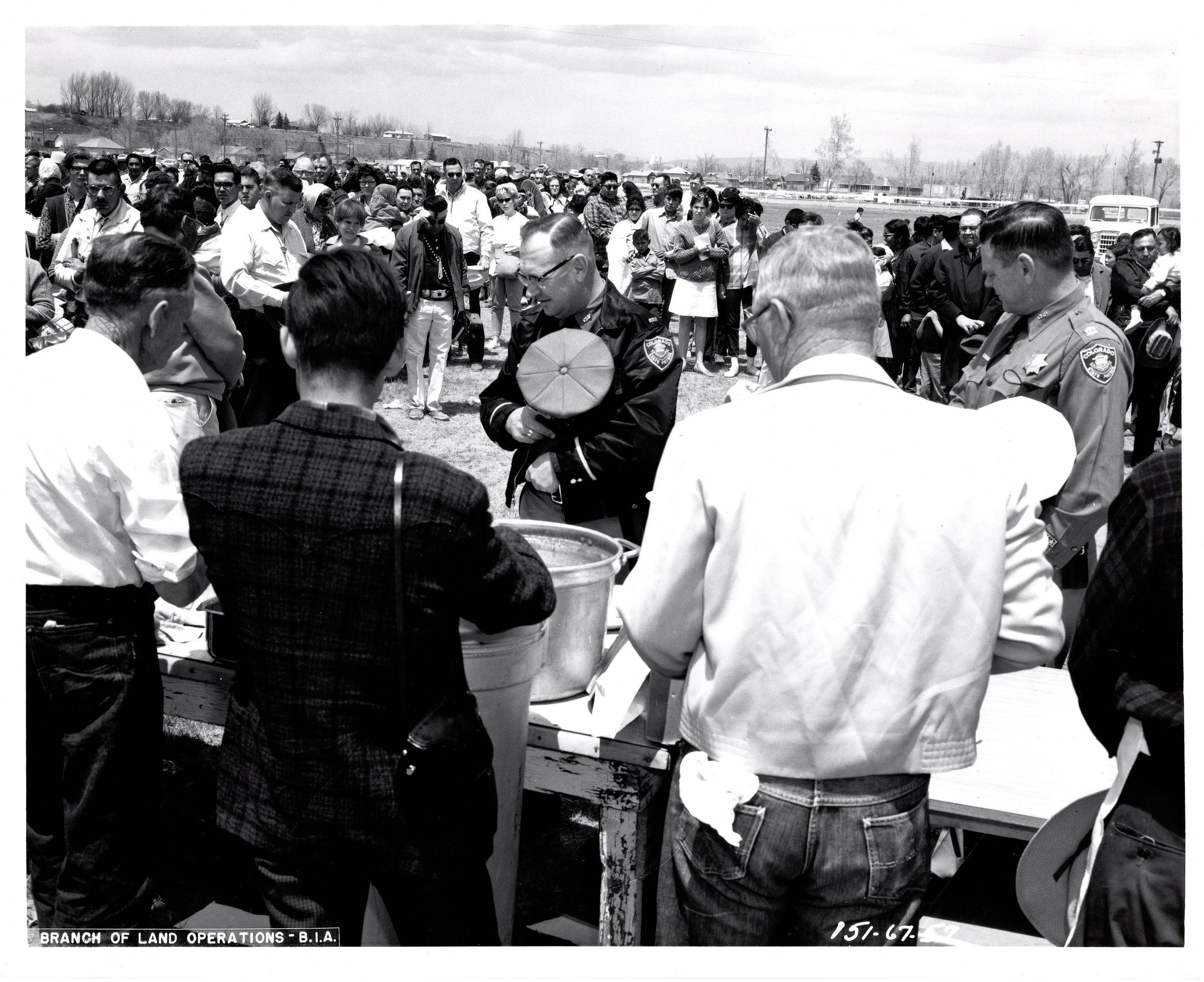 Black and white photo of men standing in front of large pots with their backs to the camera and a crowd of people in front of them. It appears as if they are serving food to the crowd. There are two police officers just in front of the serving table. Event is outdoors.Collection