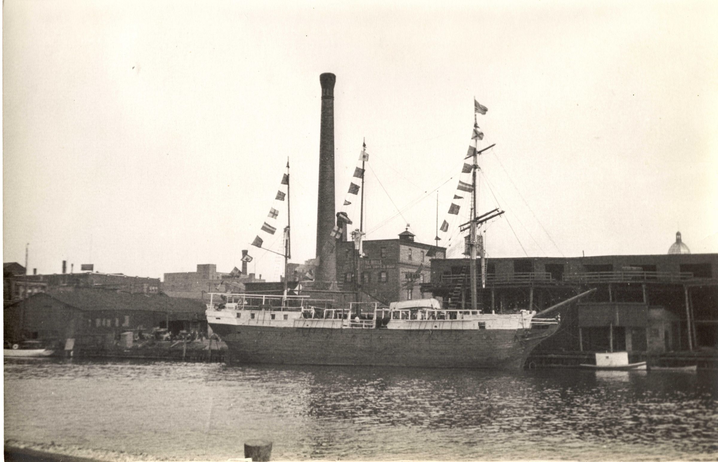 Black and white photograph of a docked ship in front of a factory building with a tall smoke stack. There are flags hanging from each of the three masts of the ship from various countries.Collection