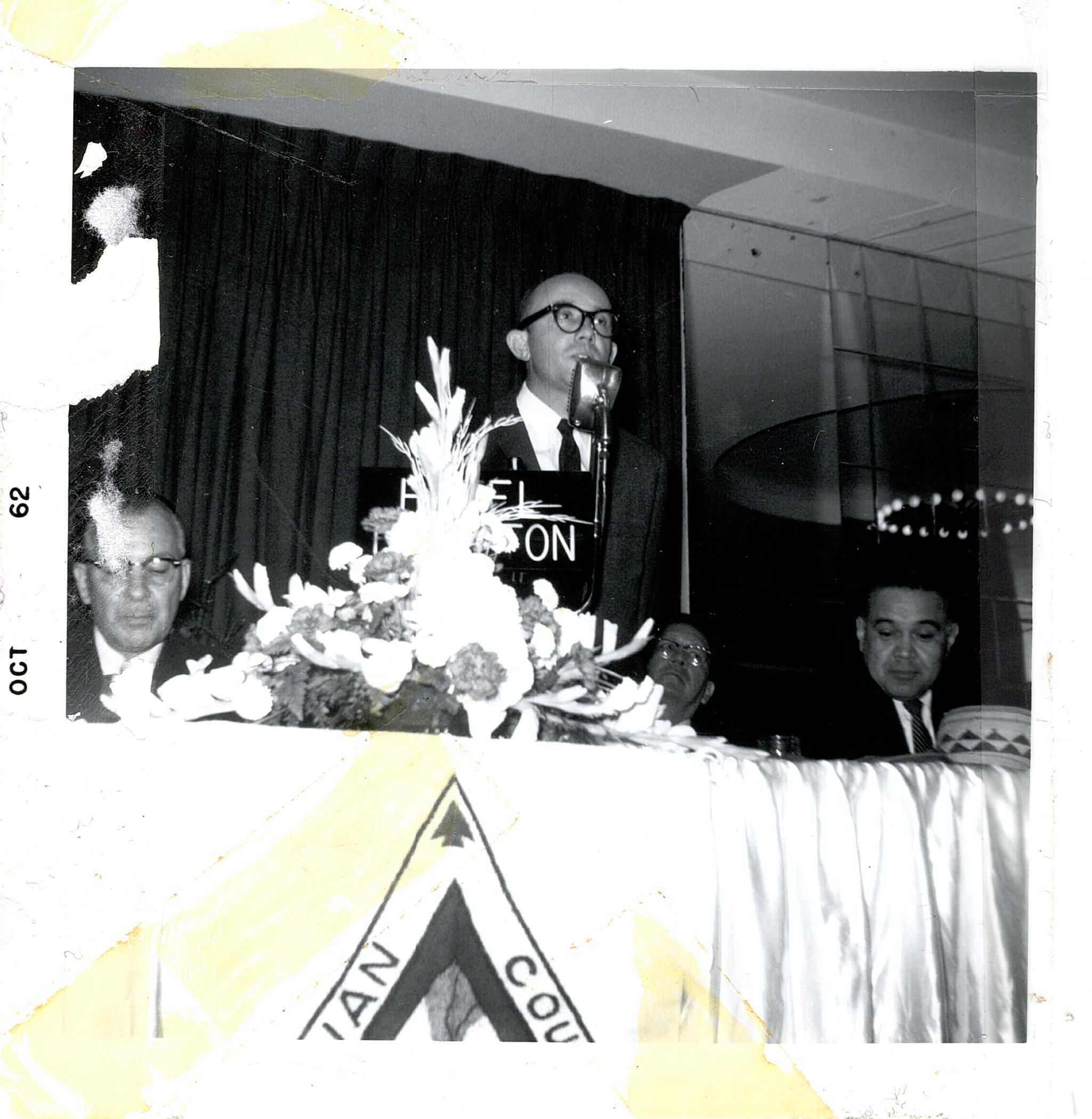 Black and white photograph of a man speaking at a microphone behind a head table. Robert Bennett is sitting to the speaker's left. There is a large floral arrangement in front with the top portion of a banner. The banner is shaped with a point at the top (triangle or arrowhead) and appears to have the partial words for "Indian" and "Council". Possibly part of the Boy Scouts.Photograph Details