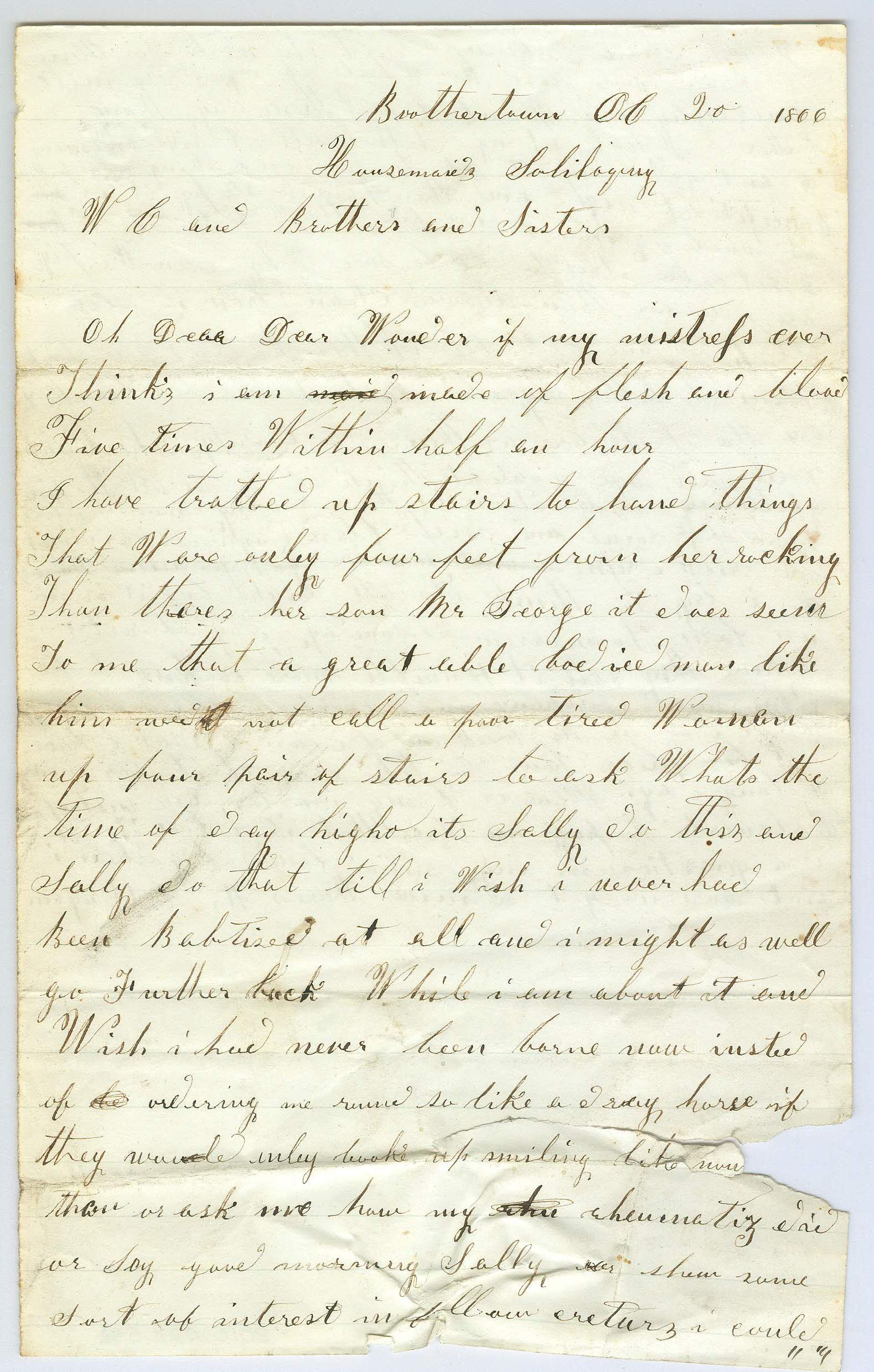 Two page soliloquy on a single sheet of paper. The top reads "Brothertown Oct 20 1866, Housemaids Soliloquy, W C and Brothers and Sisters". The first page is nicely spaced, but the second page is scrunched on the top portion and a line has been crossed out. There are faint initials at the bottom "S.L.B." that look to have been erased.Collection