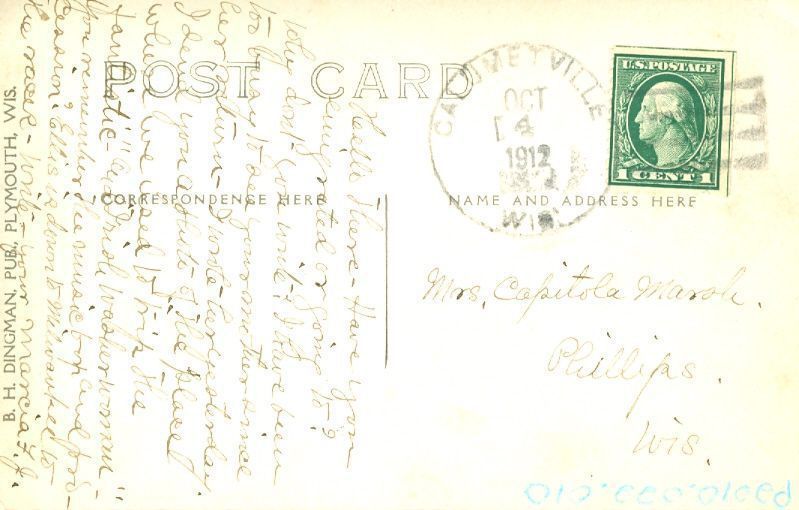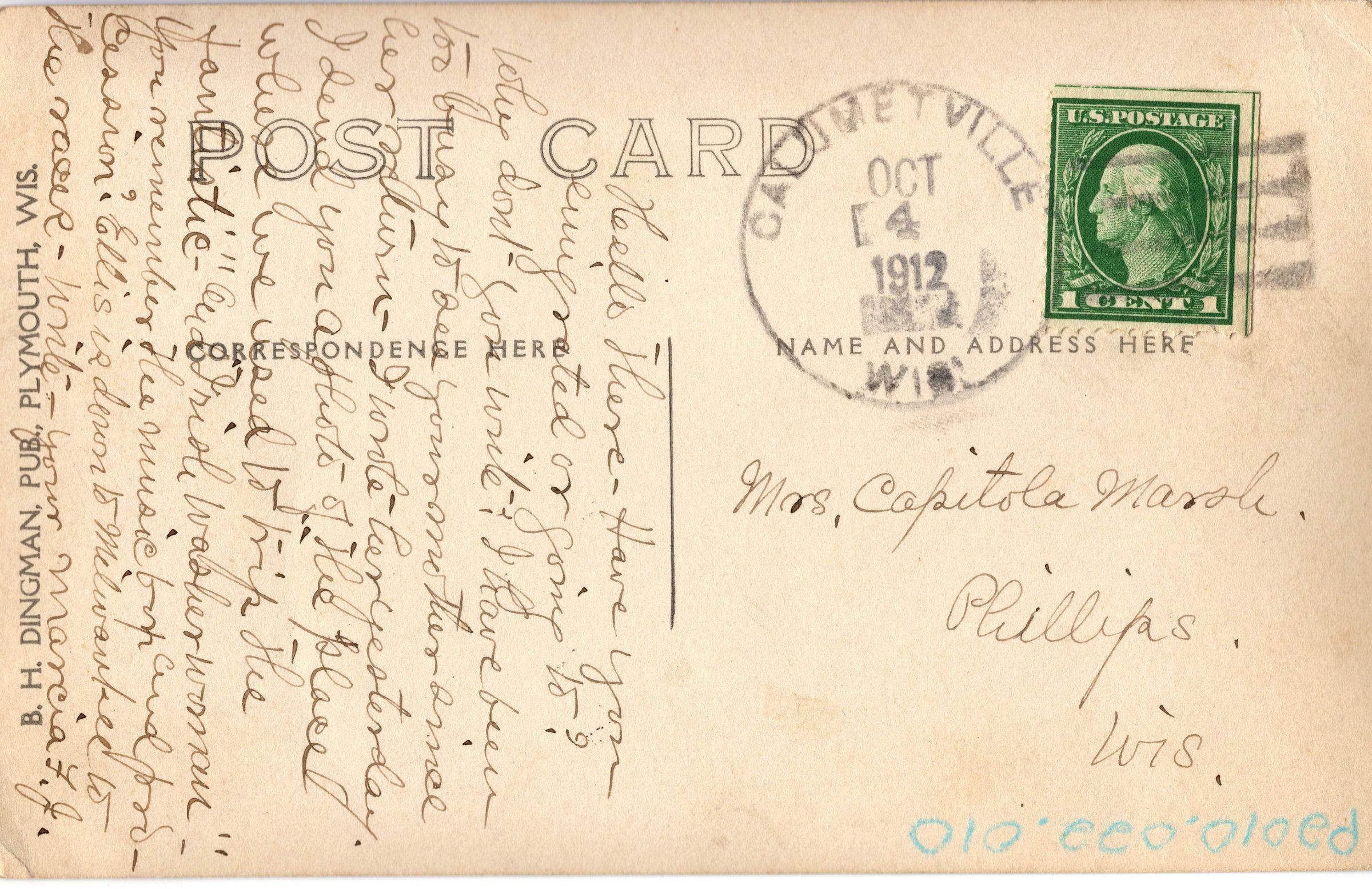 The postcard was used with a Washington 1 cent stamp and a Calumetville post office stamp. It went to Mrs. Capitola Marsh in Phillips, Wis. There is a message written (see photos).Collection