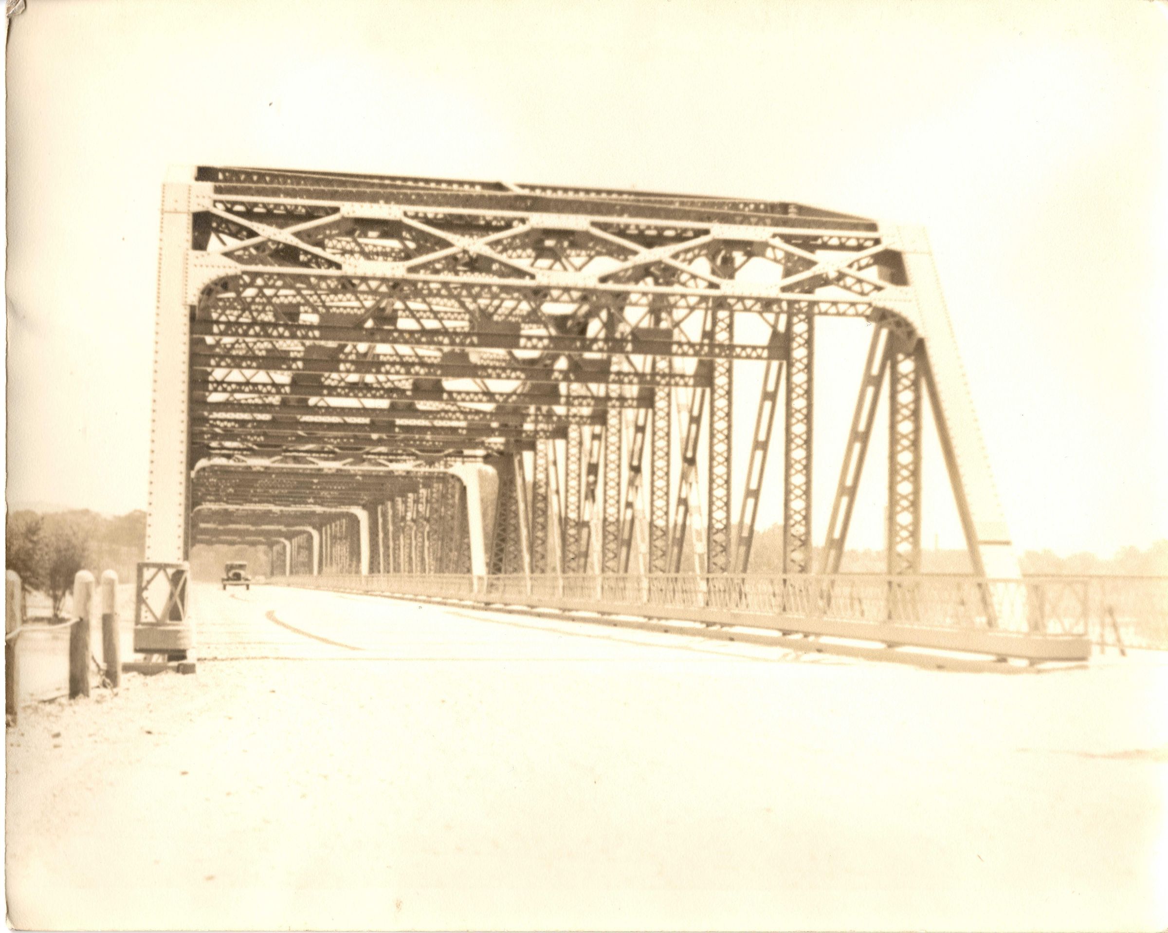 Black and white photograph of a steel bridge with an old car driving across it, towards the photographer.Collection