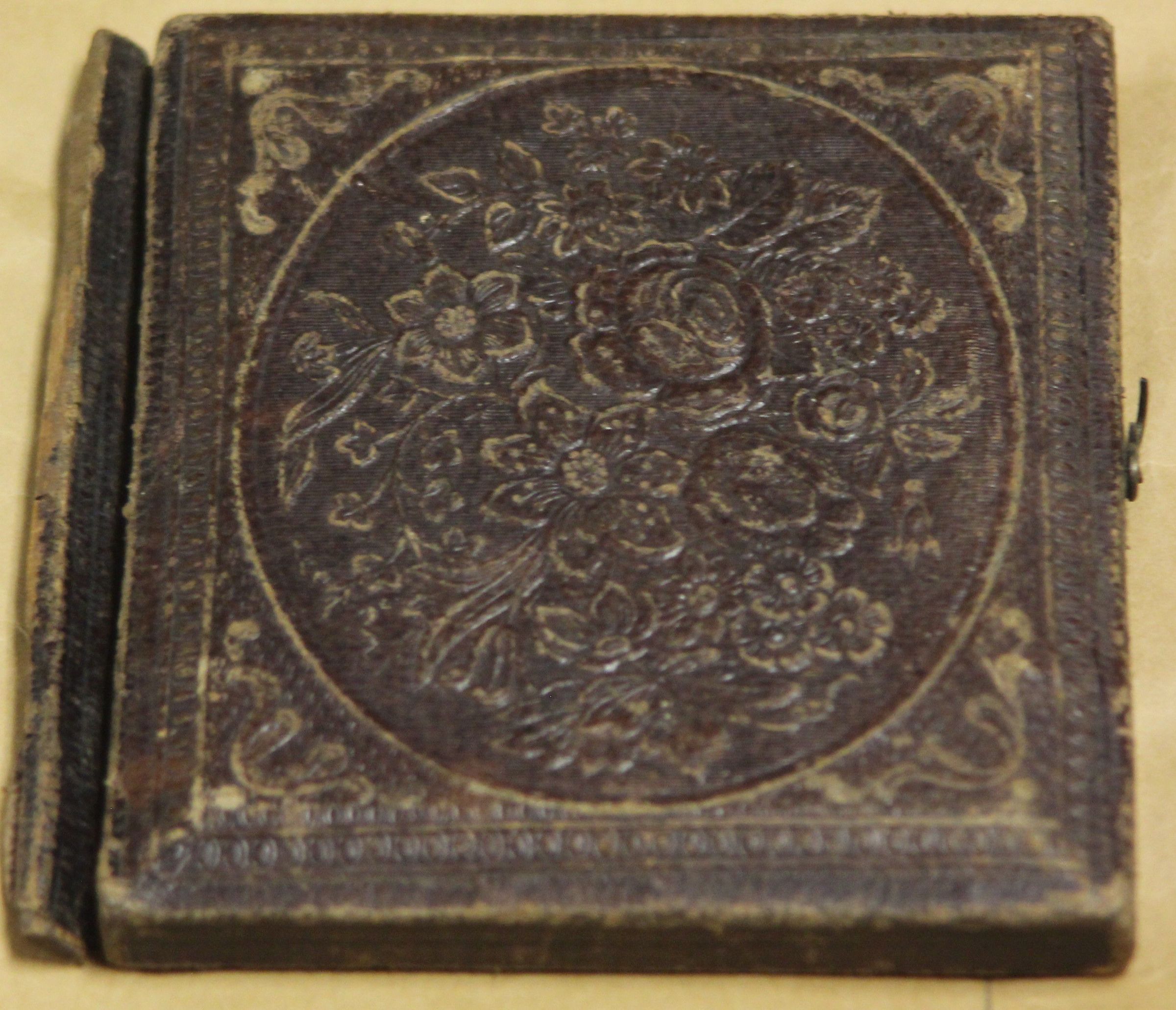 The back cover of the book is missing and the front and binding are worn. There are two spots, one to the left of each man's head on the tintype.Photograph Details