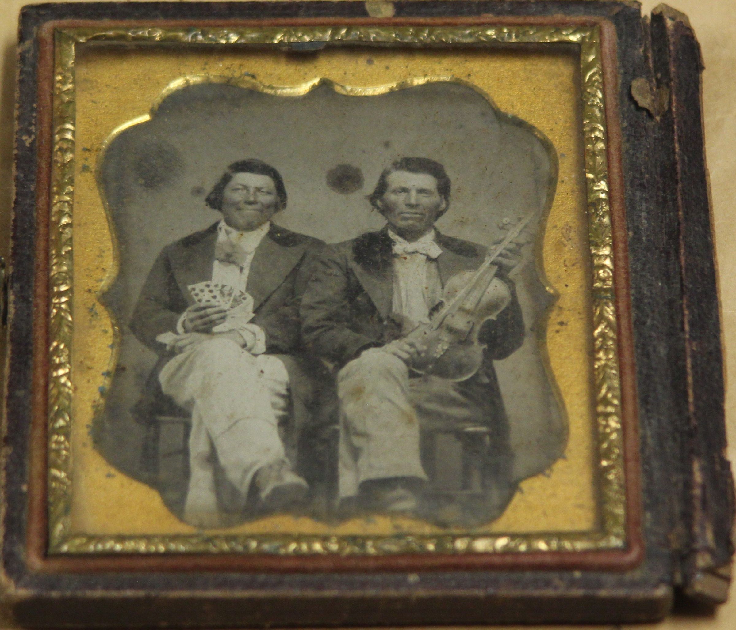 Tintype of two men sitting with the legs crossed in suits and bow ties. The man on the left is holding a hand of cards, fanned out, and facing the camera. The man on the right is holding a violin and bow. The tintype is framed in a latched book with a gold metal decorative frame around the image. The outside of the book (the cover) is of a bouquet of flowers in a circle and flourishes in each of the corners. It is a brown color. The tintype was housed in a brown colored envelope with "Syman P Fowler with violin" and #43. This is most likely O.E. Heller's organization system.