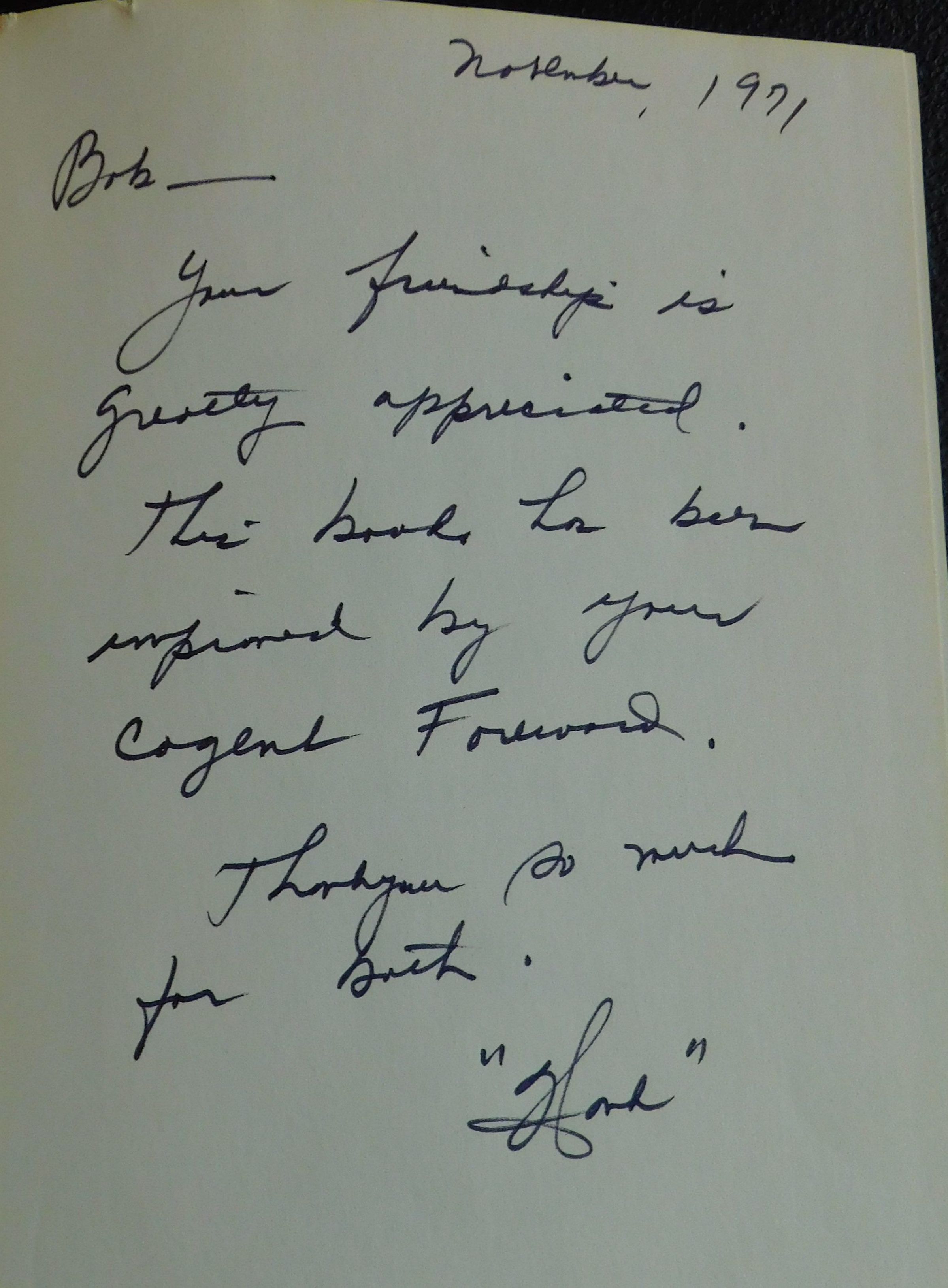 November, 1971, Bob-your friendship is greatly appreciated. This book has been inspired by your cogent foreword. Thank you so much for both. "Hank".Other Names and Numbers