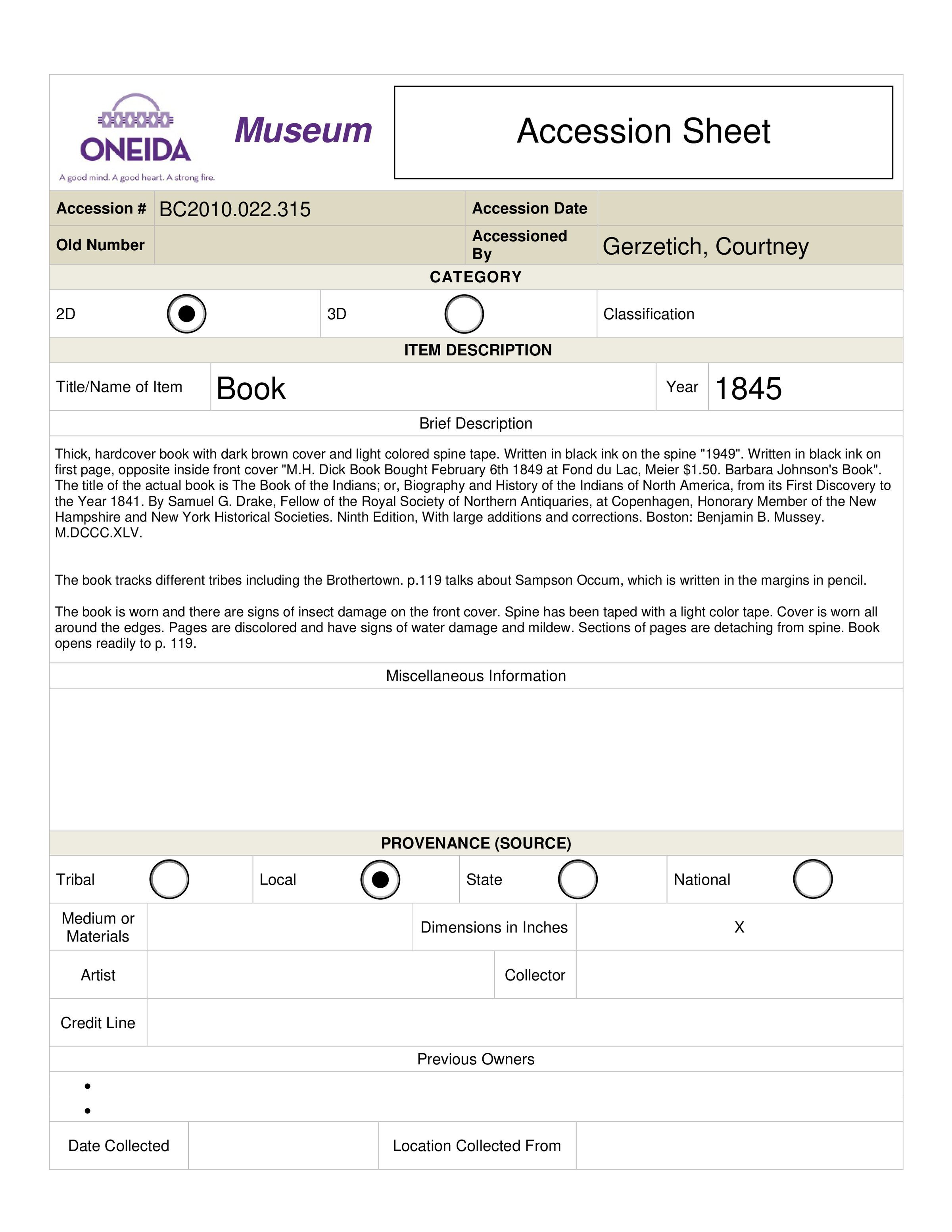 Brothertown Indian Nation holds physical copies and copyright; contact Brothertown for reproductions and publishingCreated By