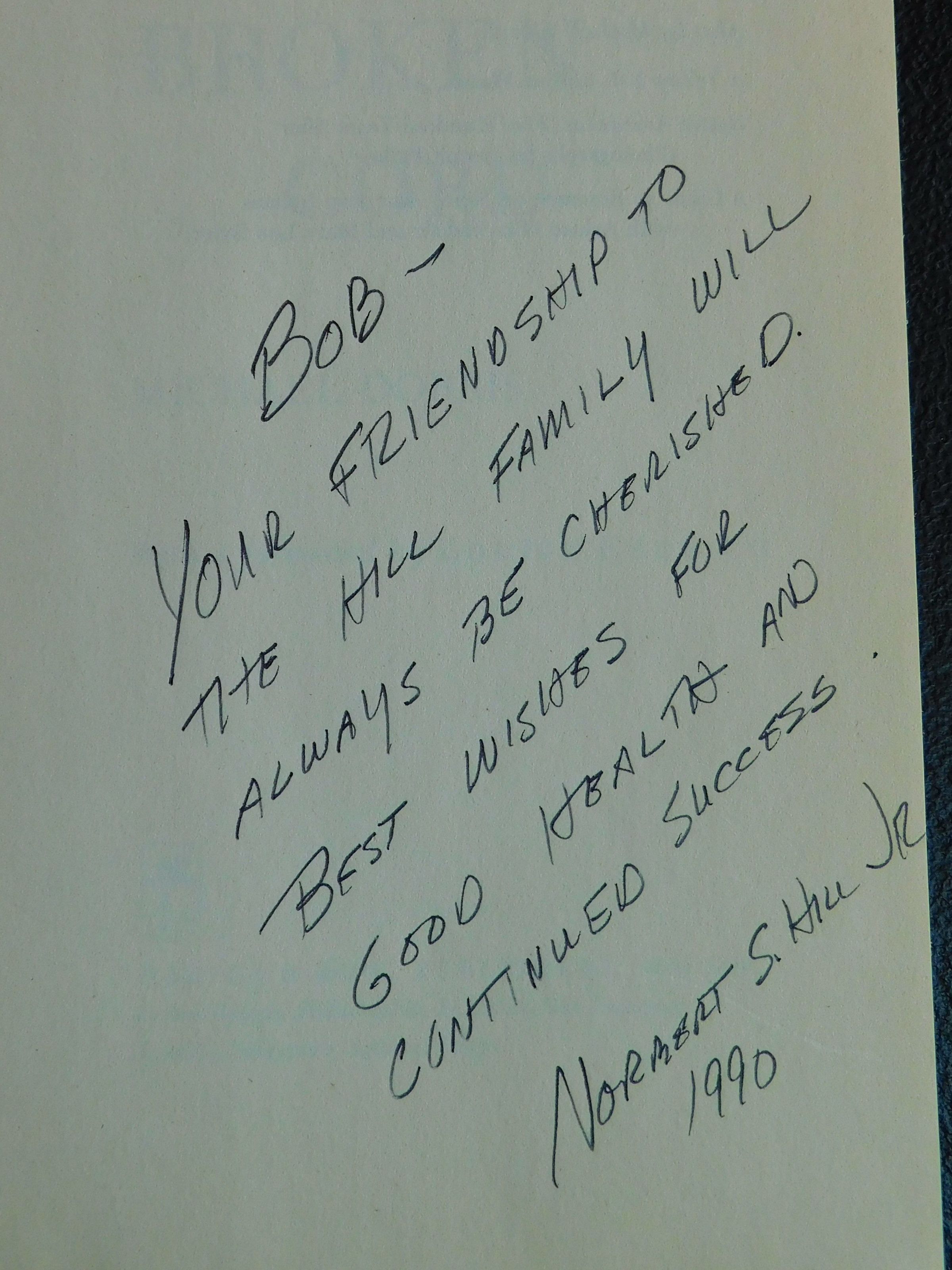 Bob-Your friendship to the Hill family will always be cherished. Best wishes for good health and continued success. Norbert S. Hill, Jr. 1990. Type