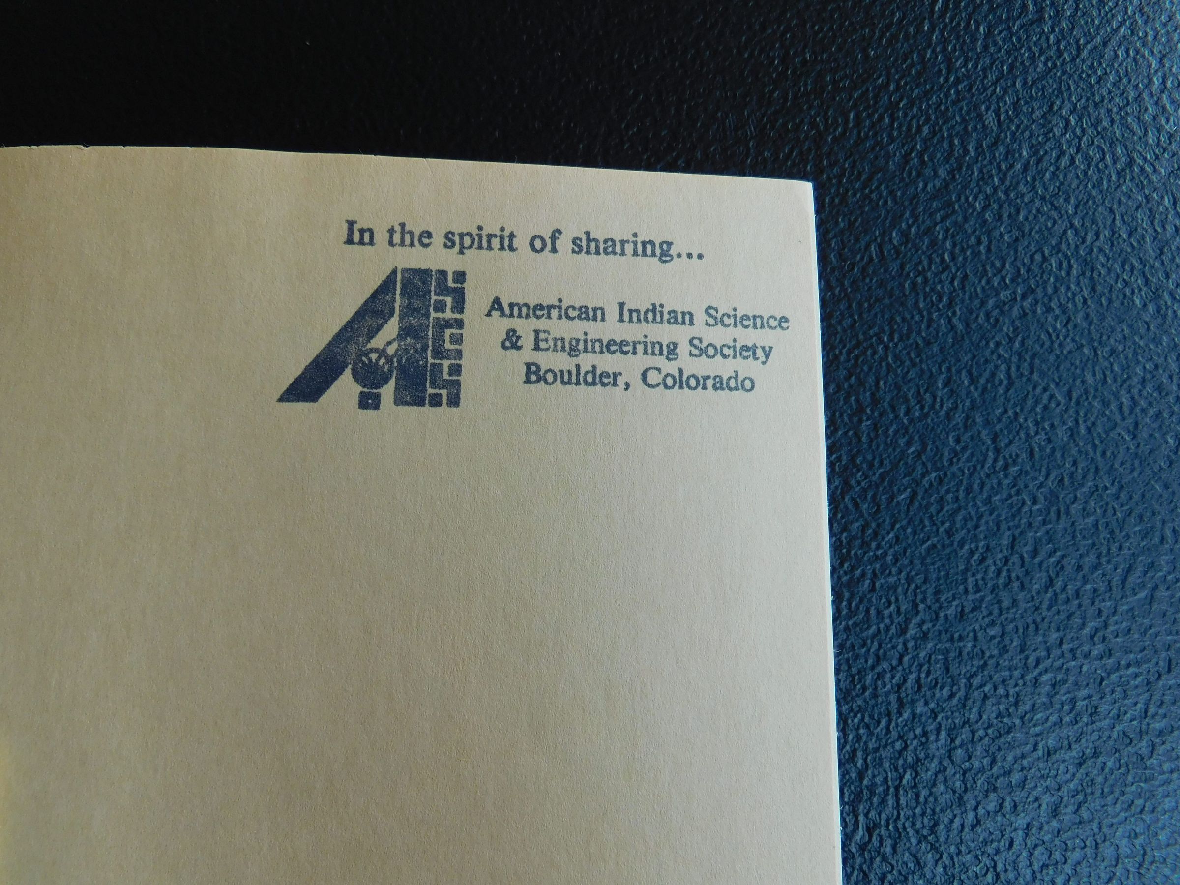 In the spirit of sharing...American Indian Science & Engineering Society, Boulder, Colorado.Other Names and Numbers