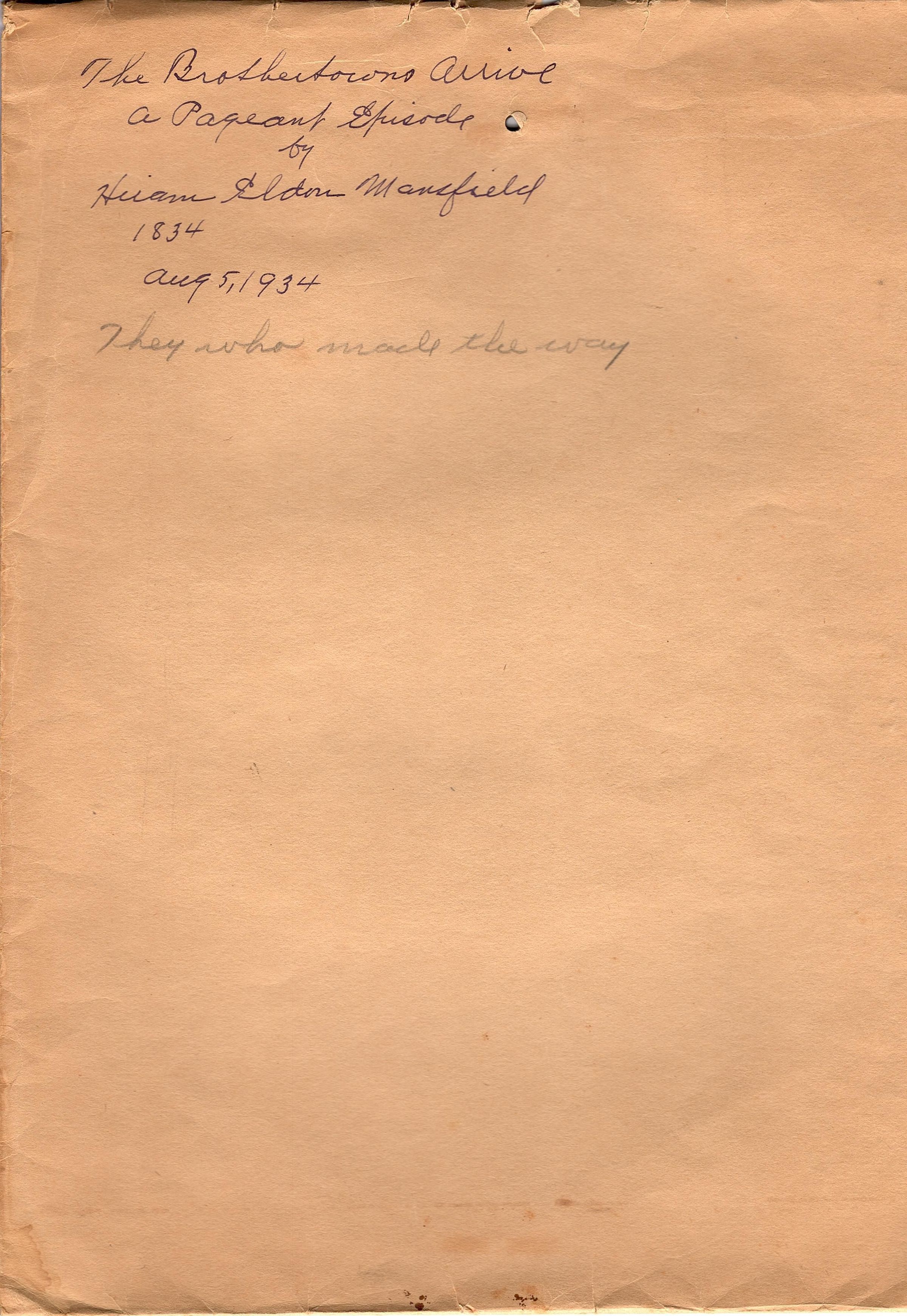 Manila envelope that must have contained the play script and letter from Mansfield. Written in black ink on the top left corner "The Brothertowns Arrive, A Pageant Episode, By, Hiram Eldon Mansfield, 1834, Aug 5, 1934". And below this in pencil "They who made the way".Collection