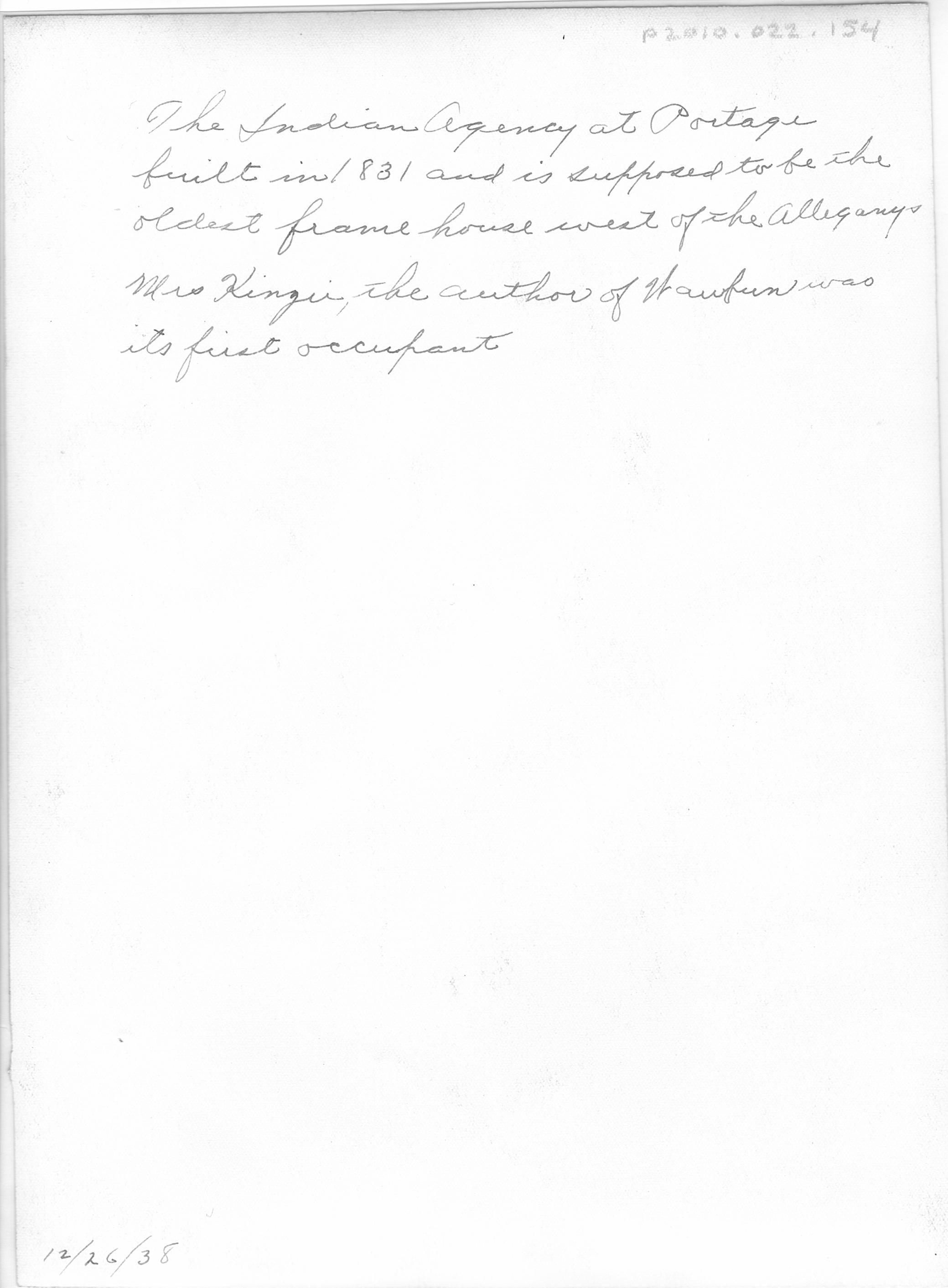 "The Indian Agency at Portage built in 1831 and is supposed to be the oldest frame house west of the Alldganys. Mrs. Kinzie, the author of Waufun was its first occupants. 12/26/38."Location