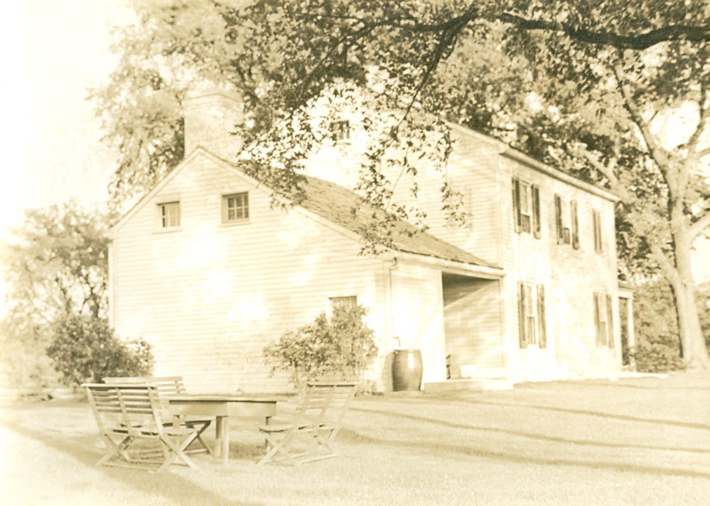 Black and white photograph of a light colored, two-story house. There is a table and folding chairs in the lawn in the