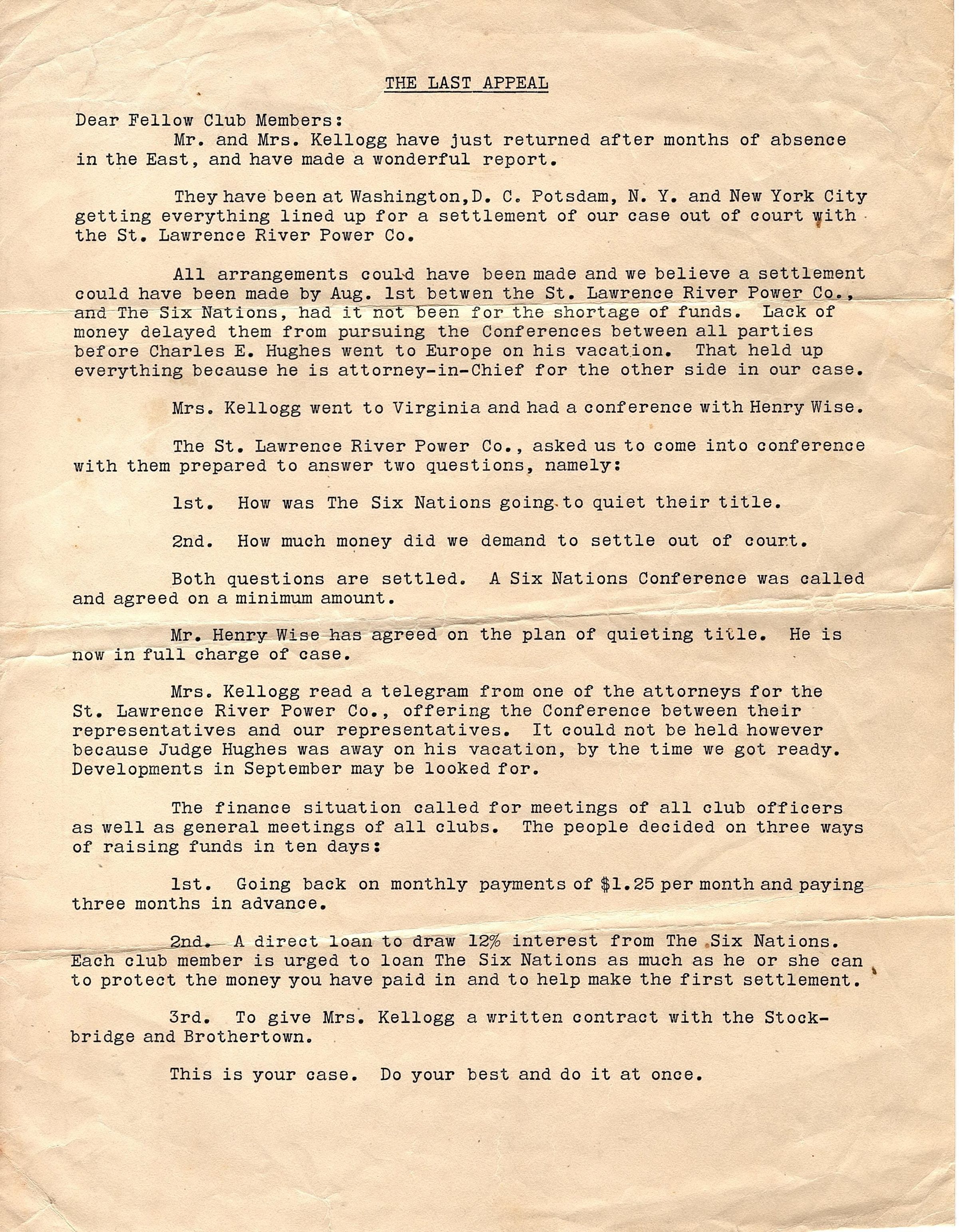 Single page, typed text with a title "The Last Appeal". It speaks to club members and the work Mr. and Mrs. Kellogg have done to get a legal case ready to settle out of court between the Six Nations and the St. Lawrence River Power Co. It highlights that it could have been settled out of court if funds hadn't run short. There are three proposals to raise money at the bottom: advanced payments, 12% interest loan and members giving as much money as they can, or contract with Stockbridge and Brothertown.Collection
