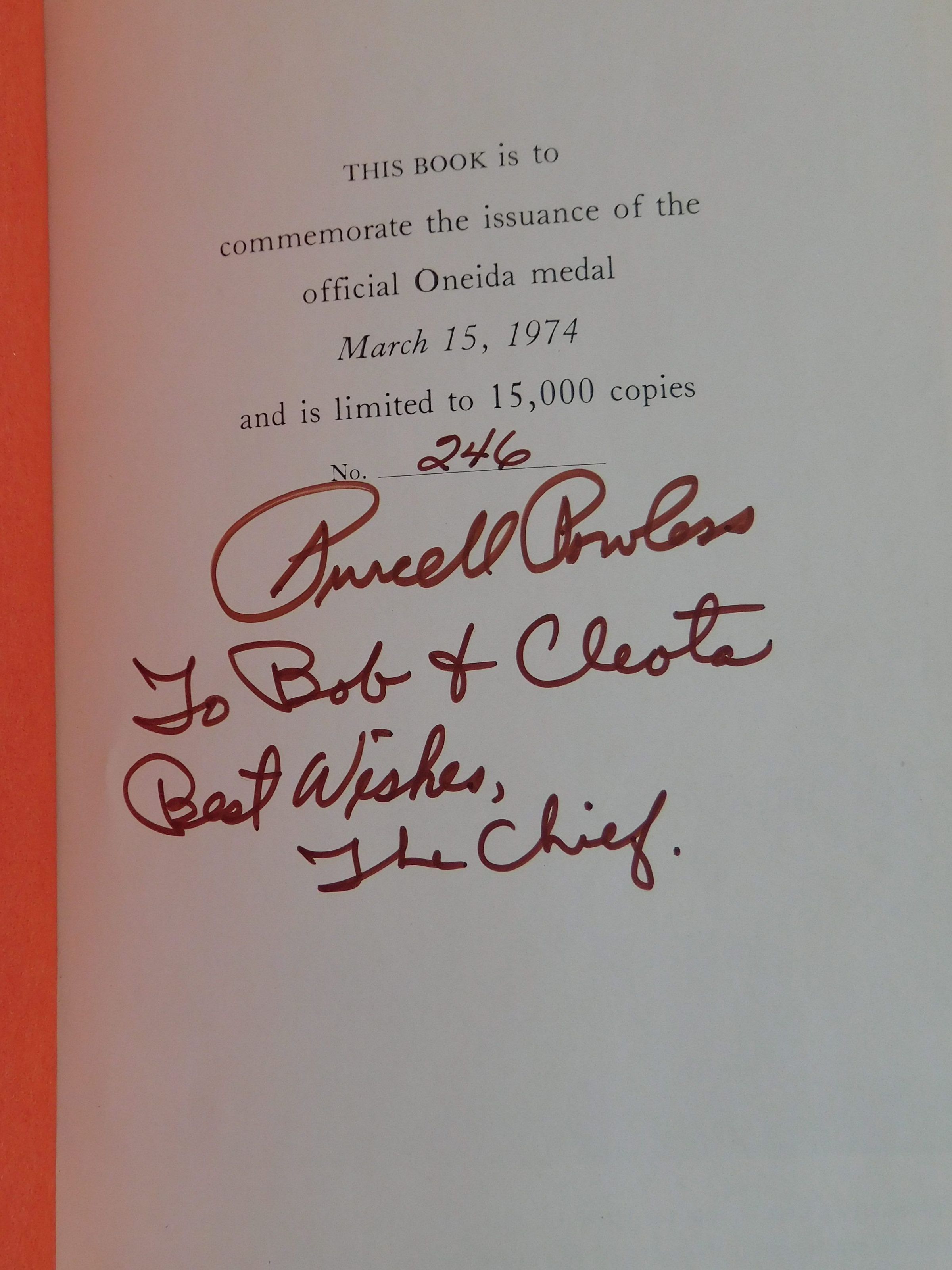 This book is to commemorate the issuance of the official Oneida medal March 15, 1974 and is limited to 15,000 copies. No. 246.Location