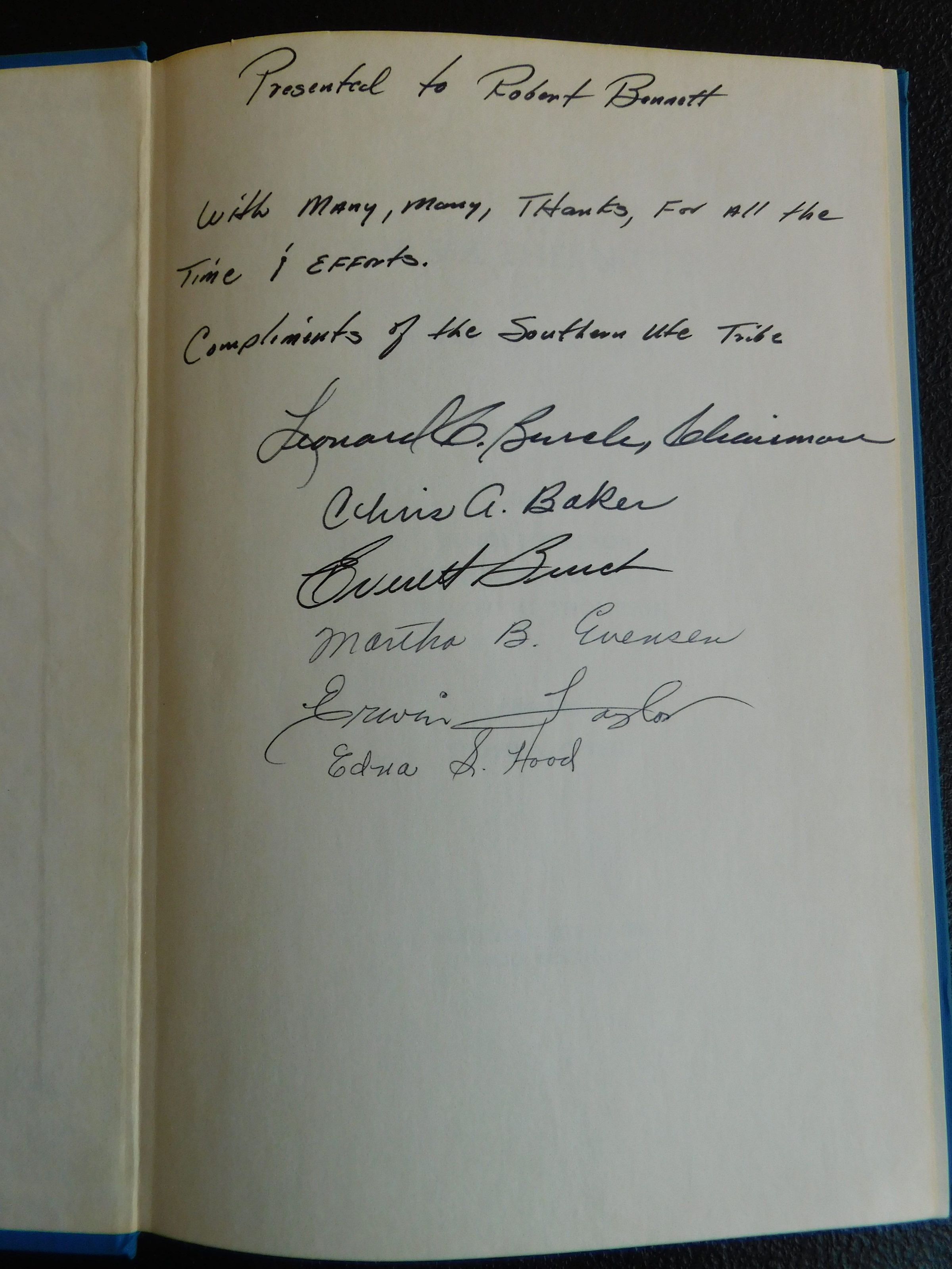Presented to Robert Bennett, with many, many, thanks, for all the time and efforts. Compliments of the Southern Ute Tribe. [signed by] Leonard C. Burck, Chairman; Chris A. Baker; Everett Burck; Martha B. Evensen; Erwin Taylor; Edna S. Hood.Other Names and Numbers