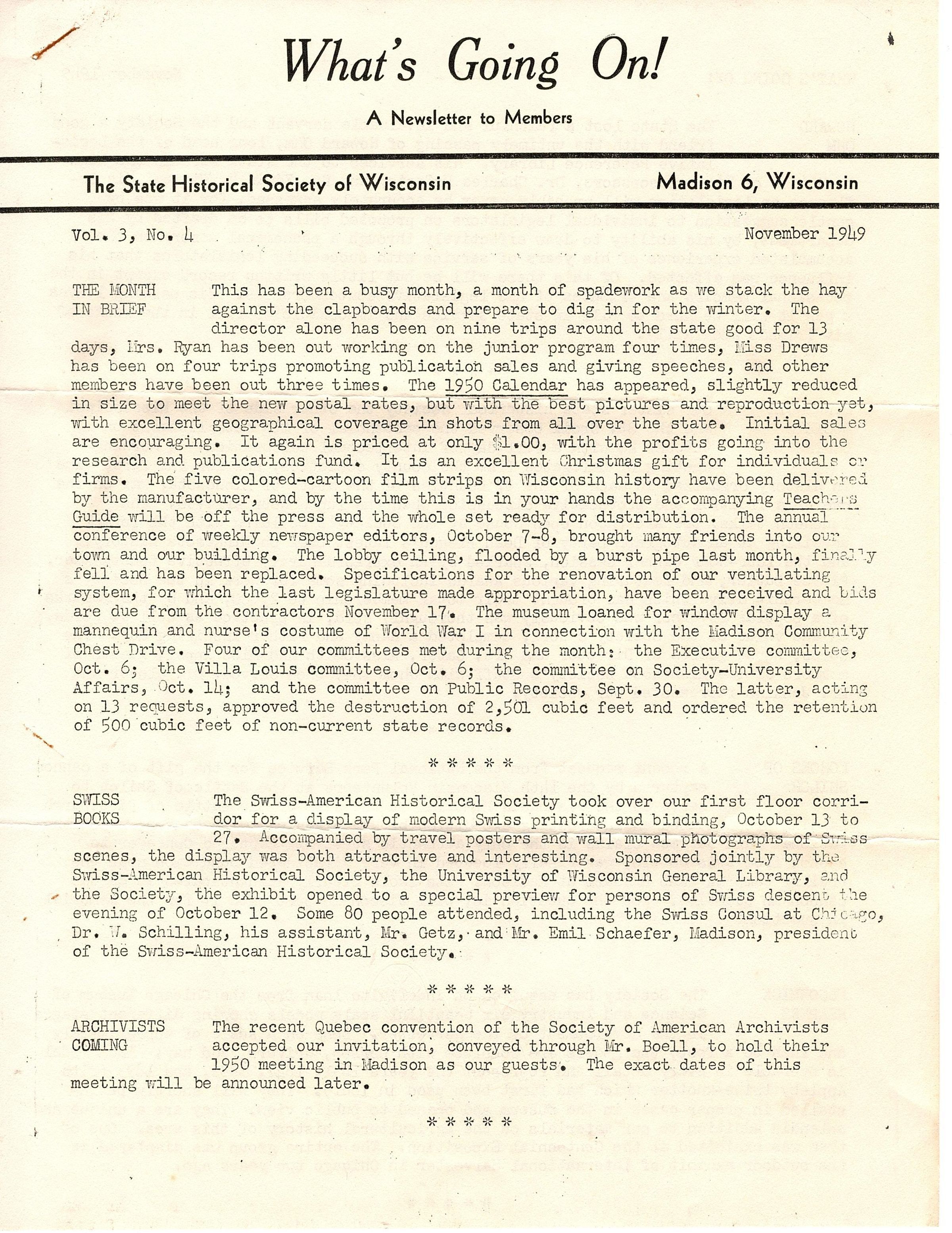 Four typed sheets of paper that make up eight pages of content for a newsletter that is titled "What's Going On! A Newsletter to members, The State Historical Society of Wisconsin". It is dated November 1949. On page seven the "Local Historical Societies" has been bracketed with pencil.Collection